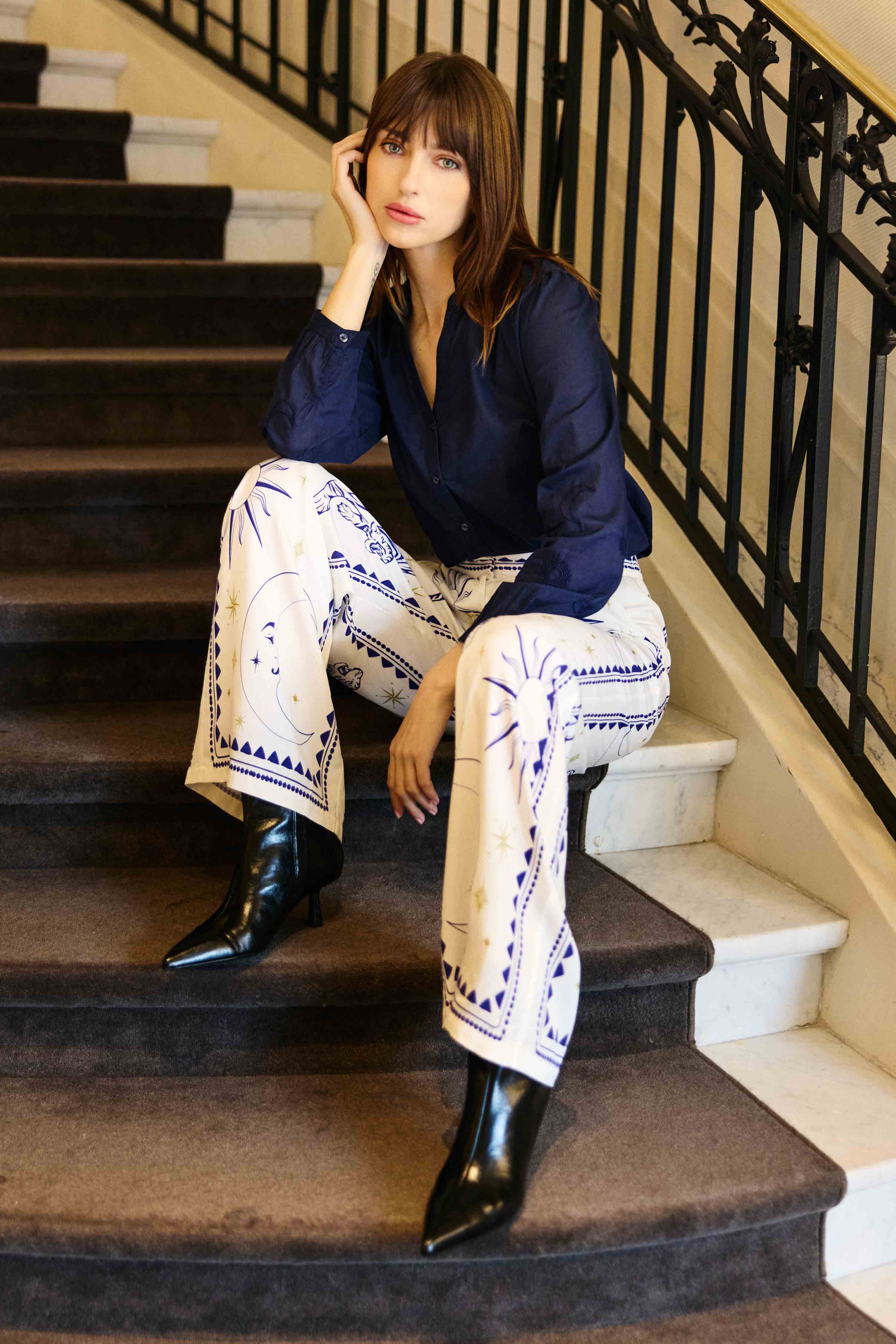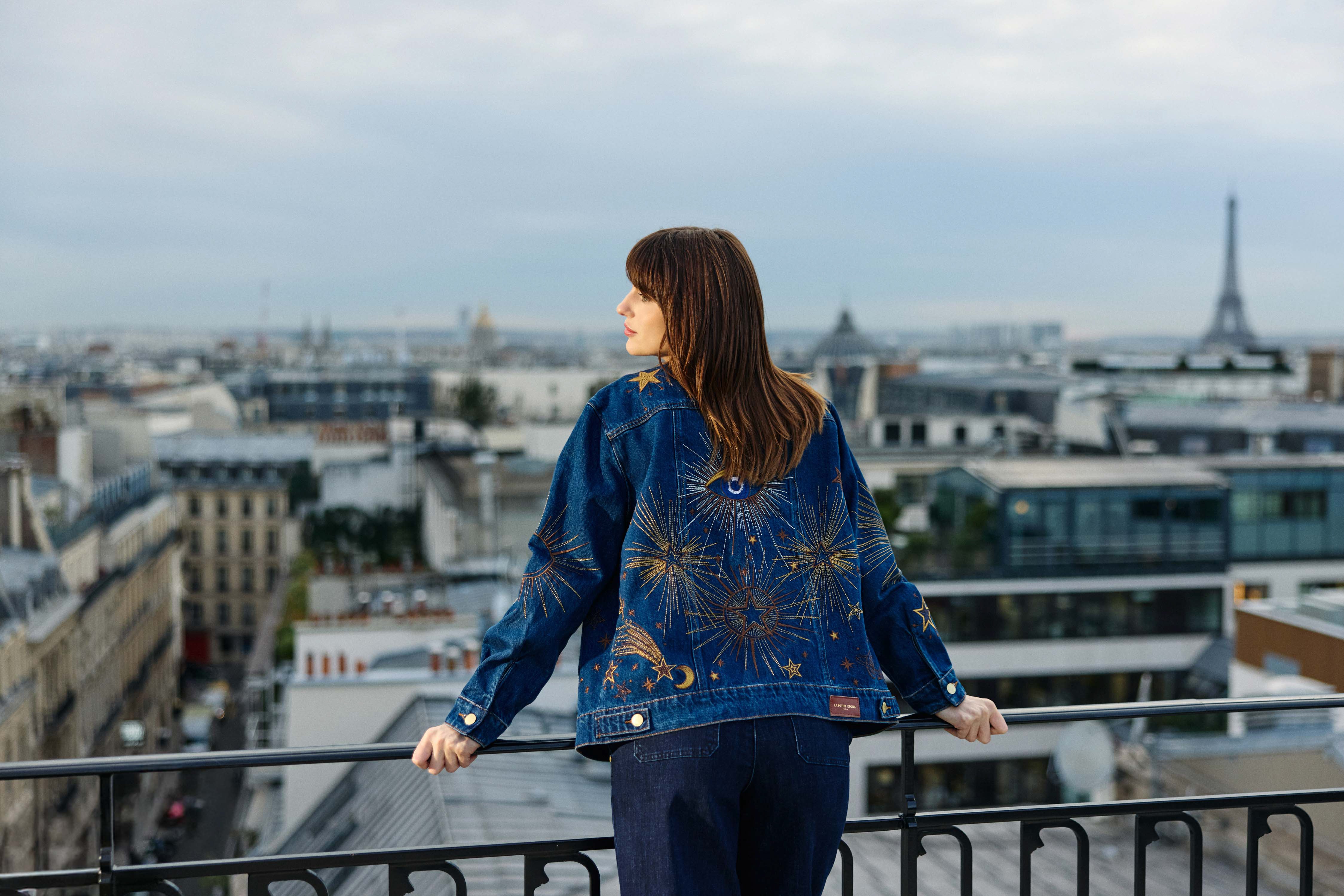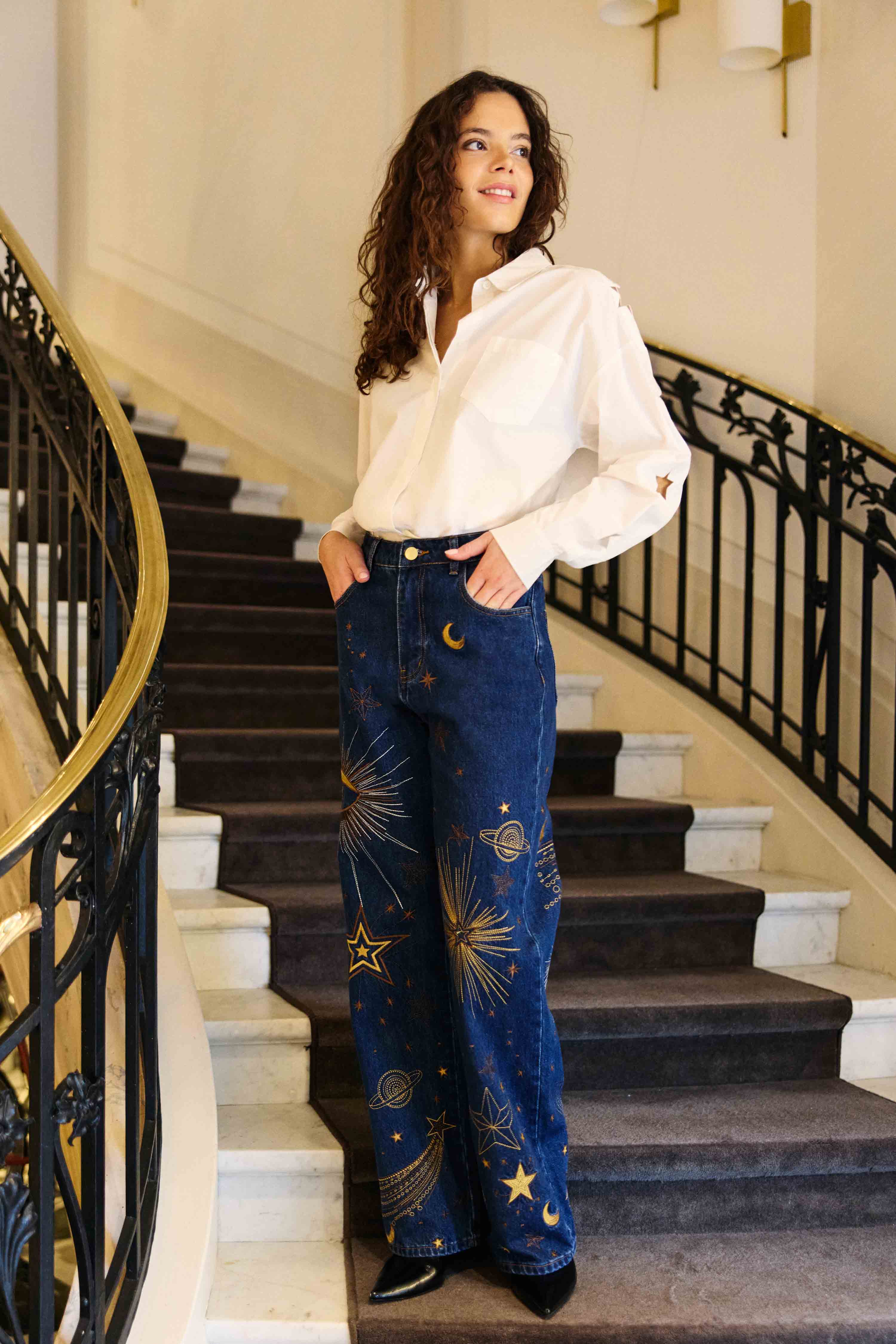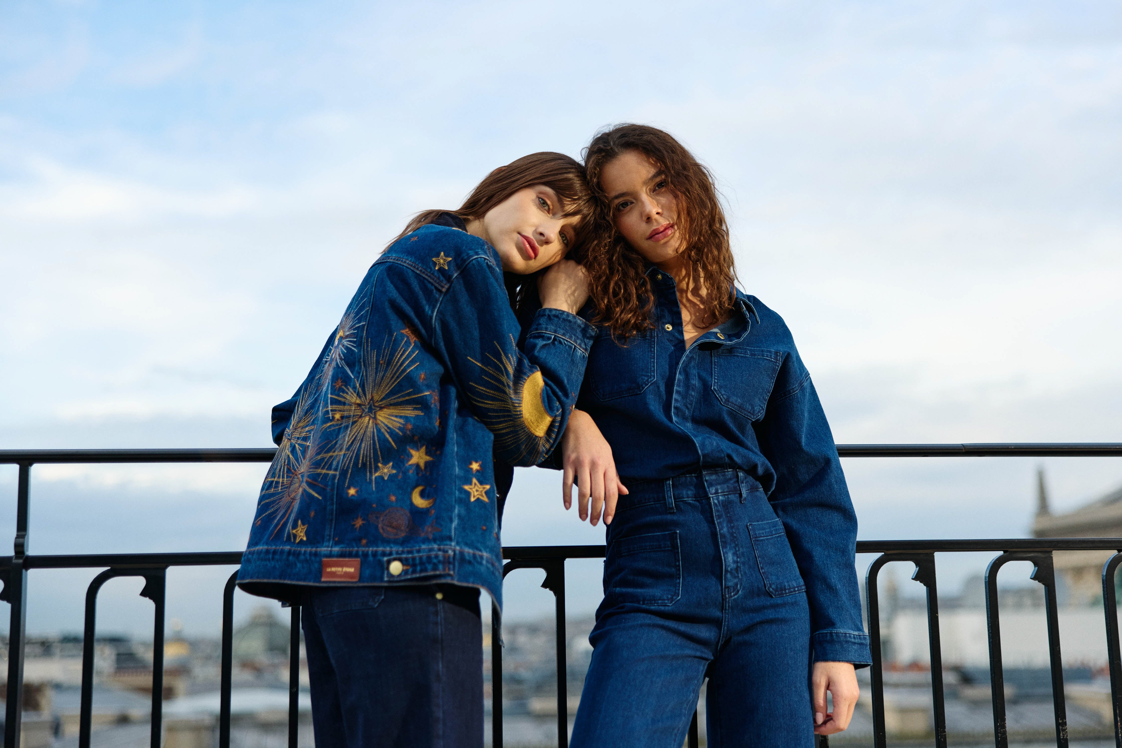 Dans ce nouveau vestiaire, les matières naturelles dialoguent avec la lumière : la viscose et le coton offrent des tombés fluides sur un camaïeu de bleus — du doux ciel pastel au marine le plus profond —, et le denim se décline en une nouvelle série de délavages à porter selon les humeurs… et le temps ! Les nuances de bleu se répondent, captant les reflets du ciel parisien à l’aube comme au crépuscule, et les toiles jacquard racontent des histoires, ponctuées de broderies dorées, des constellations discrètes, de lunes et de signes astrologiques comme autant de clins d’œil à l’univers riche de notre étoile.