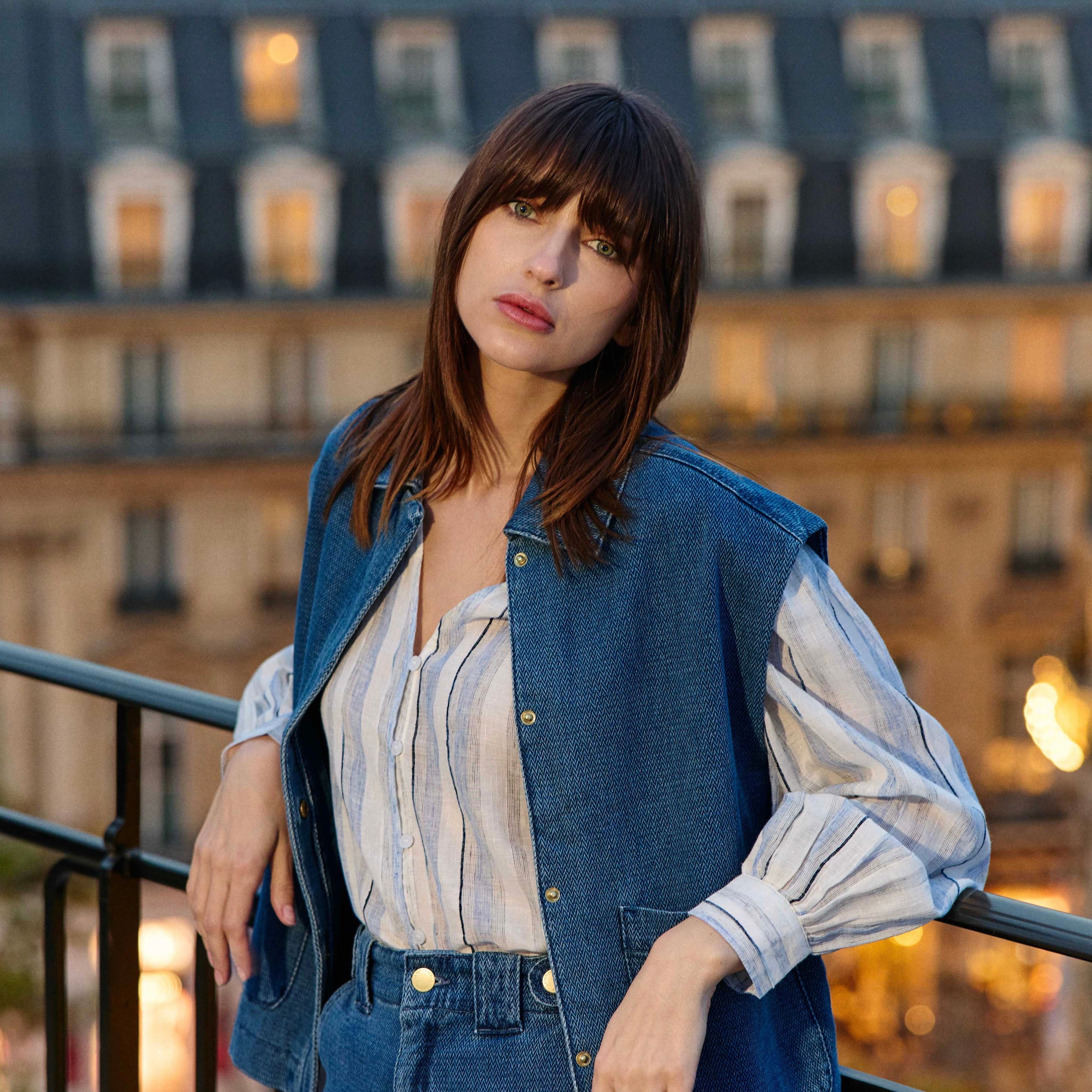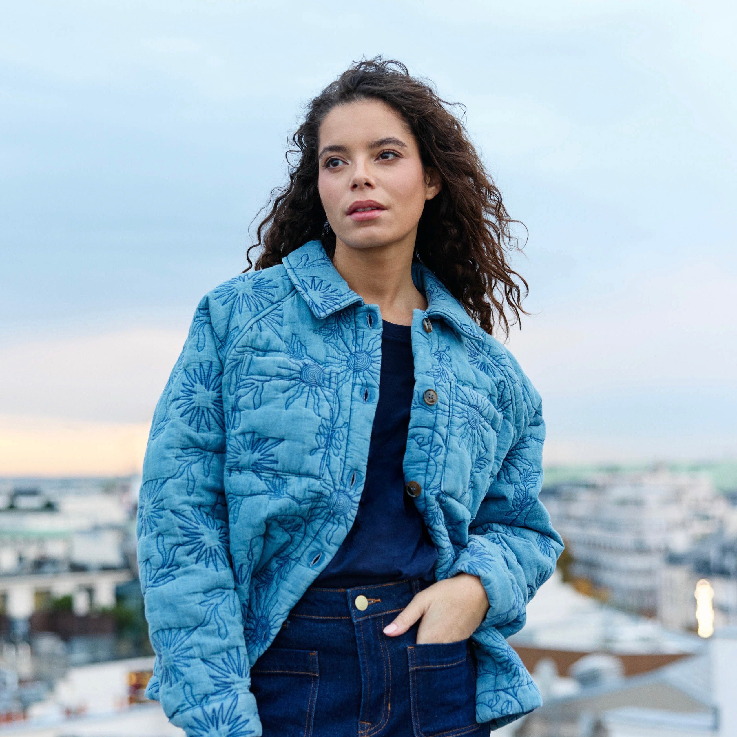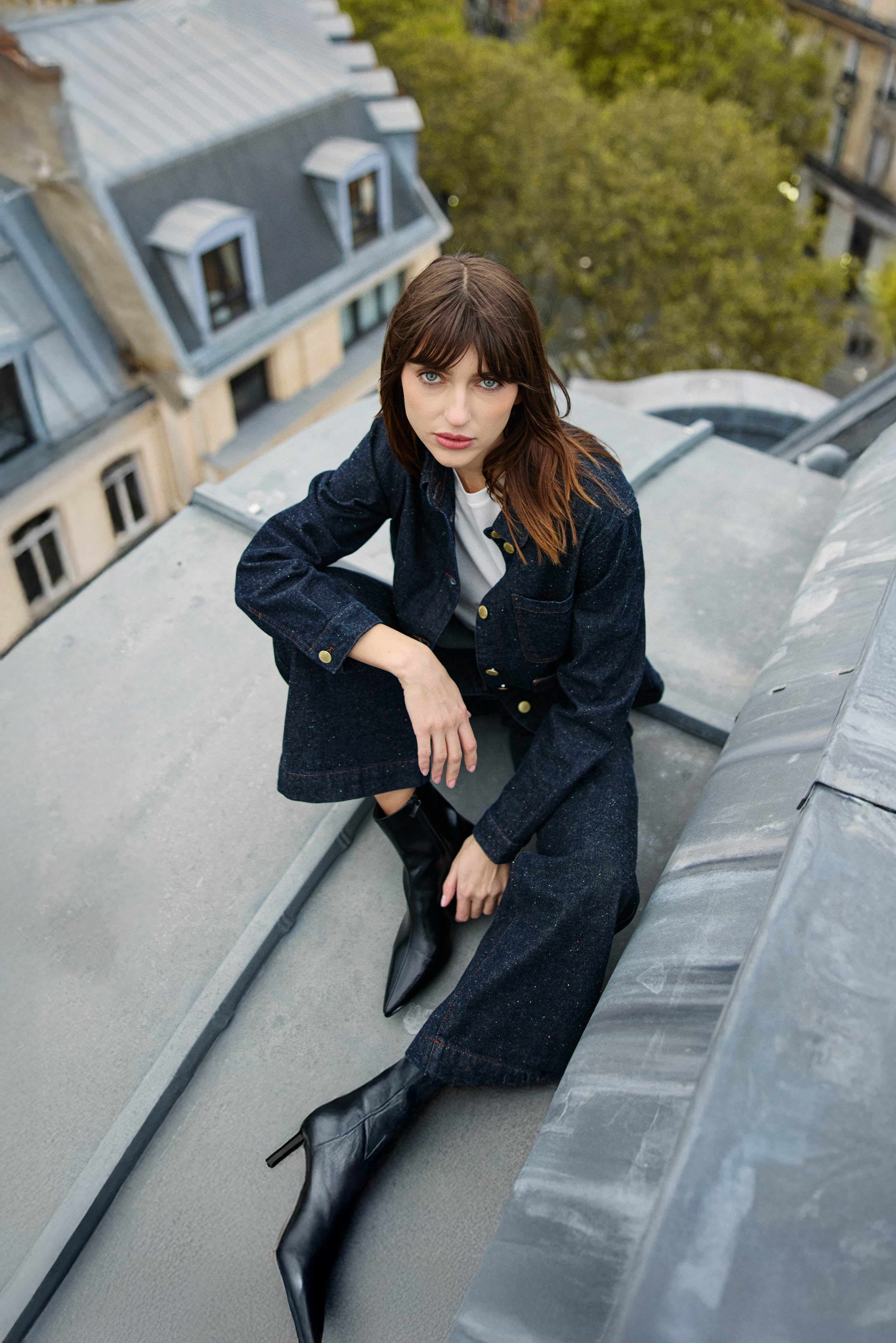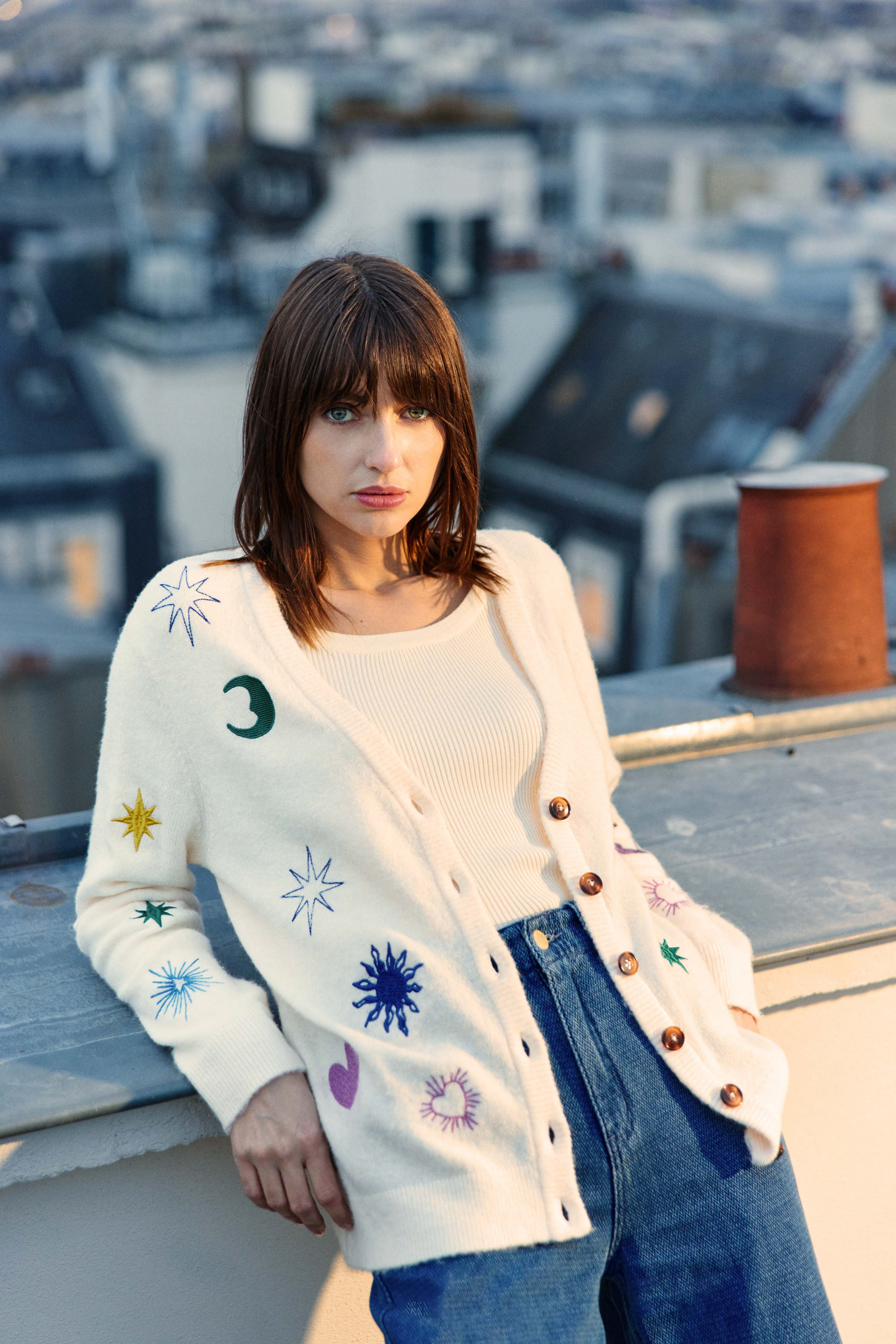 Dans ce nouveau vestiaire, les matières naturelles dialoguent avec la lumière : la viscose et le coton offrent des tombés fluides sur un camaïeu de bleus — du doux ciel pastel au marine le plus profond —, et le denim se décline en une nouvelle série de délavages à porter selon les humeurs… et le temps ! Les nuances de bleu se répondent, captant les reflets du ciel parisien à l’aube comme au crépuscule, et les toiles jacquard racontent des histoires, ponctuées de broderies dorées, des constellations discrètes, de lunes et de signes astrologiques comme autant de clins d’œil à l’univers riche de notre étoile.