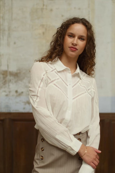 Cia, la chemise écrue en coton légèrement texturé à coupe ample, avec col chemise classique et manches longues boutonnées.