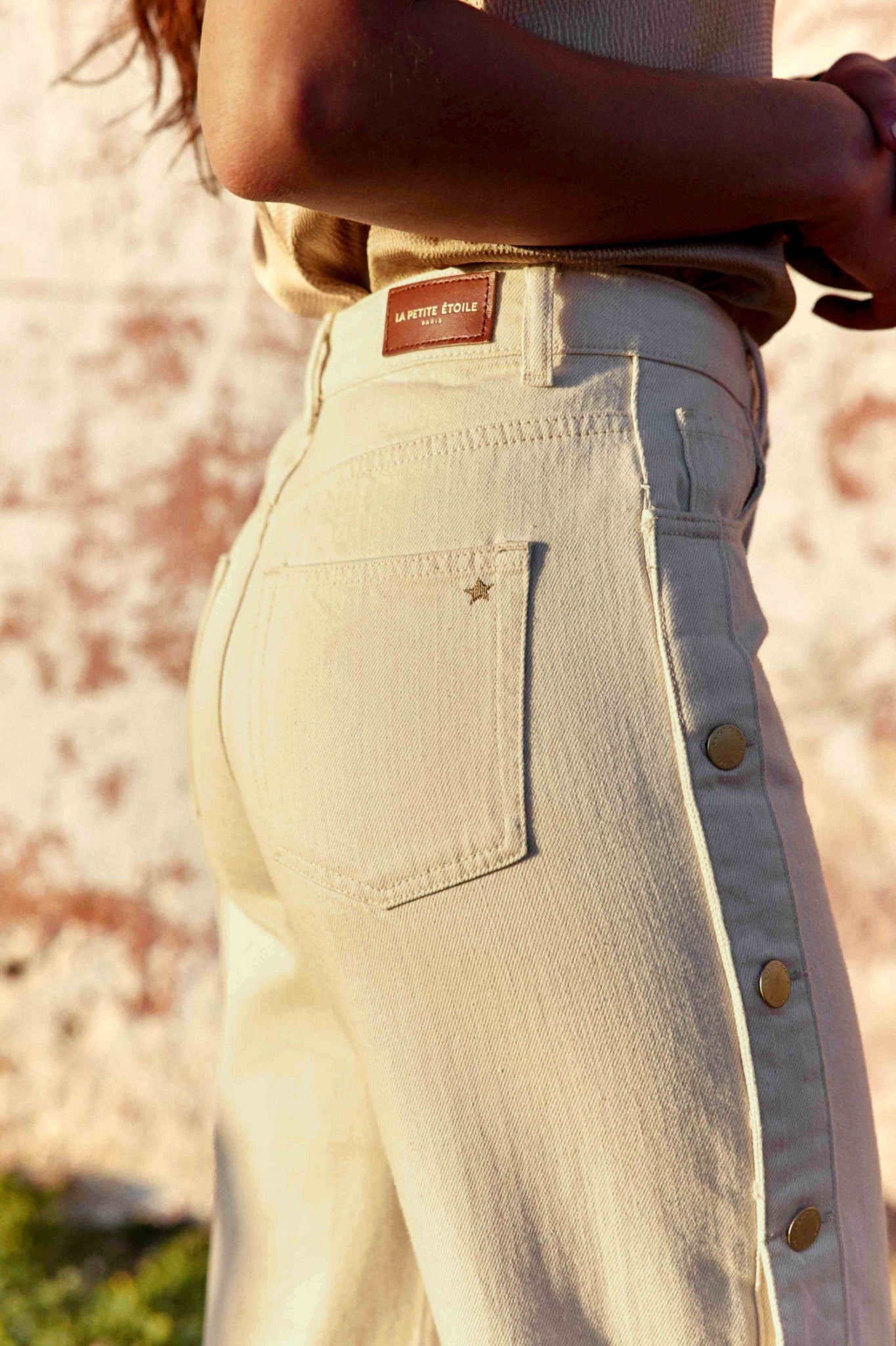 Zephyri est un jean naturel à la coupe droite et taille haute qui allonge la silhouette avec équilibre. Sa ligne nette structure la jambe tandis que la taille marquée souligne la silhouette et crée une allure élancée. Les boutons rivetés sur les côtés apportent un détail subtil qui donne du caractère à la pièce.