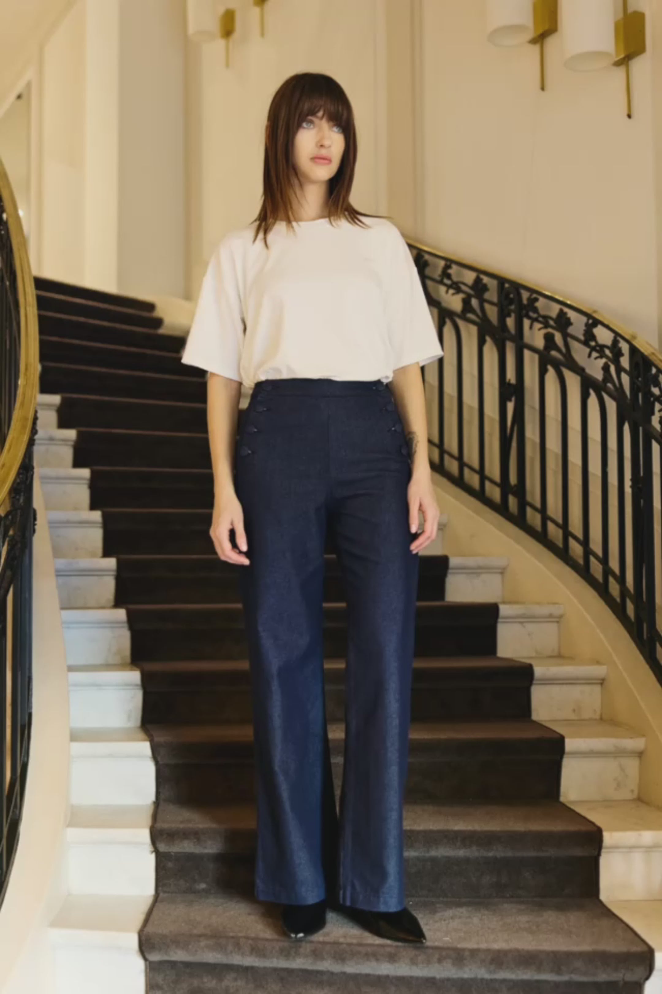 Paulie, le pantalon brut à pont à taille haute, à coupe droite, avec double boutonnage devant pour une silhouette structurée.
