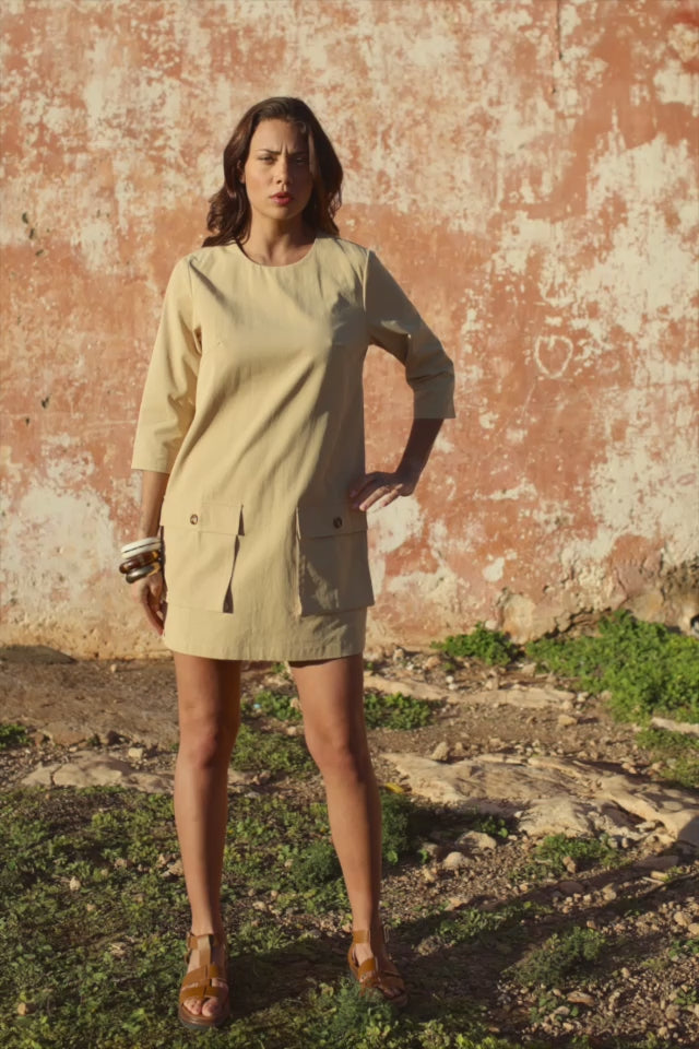 Romea est une robe courte camel qui apporte une allure moderne et structurée à la silhouette. Sa coupe trapèze crée un volume équilibré qui libère le mouvement tandis que l’encolure ronde adoucit la ligne du haut du corps. Les manches trois-quarts complètent l’ensemble avec élégance.