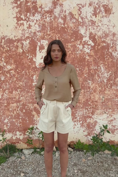 Sharon est un short large naturel qui dessine une silhouette estivale élégante et décontractée. Sa taille haute structure la ligne tandis que les jambes amples apportent de l’aisance et du mouvement. Les plis à la taille soulignent la silhouette et donnent du relief à l’ensemble.