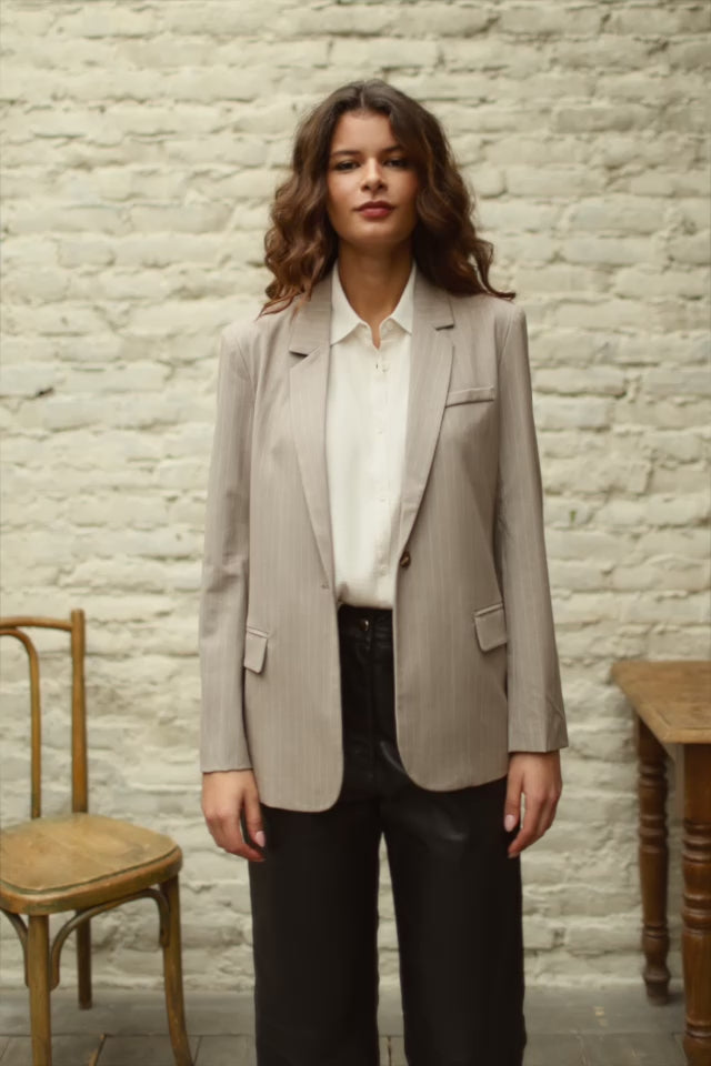 Vadal, la veste de tailleur à rayures tennis beige et écru, à coupe droite, avec col tailleur et simple boutonnage.
