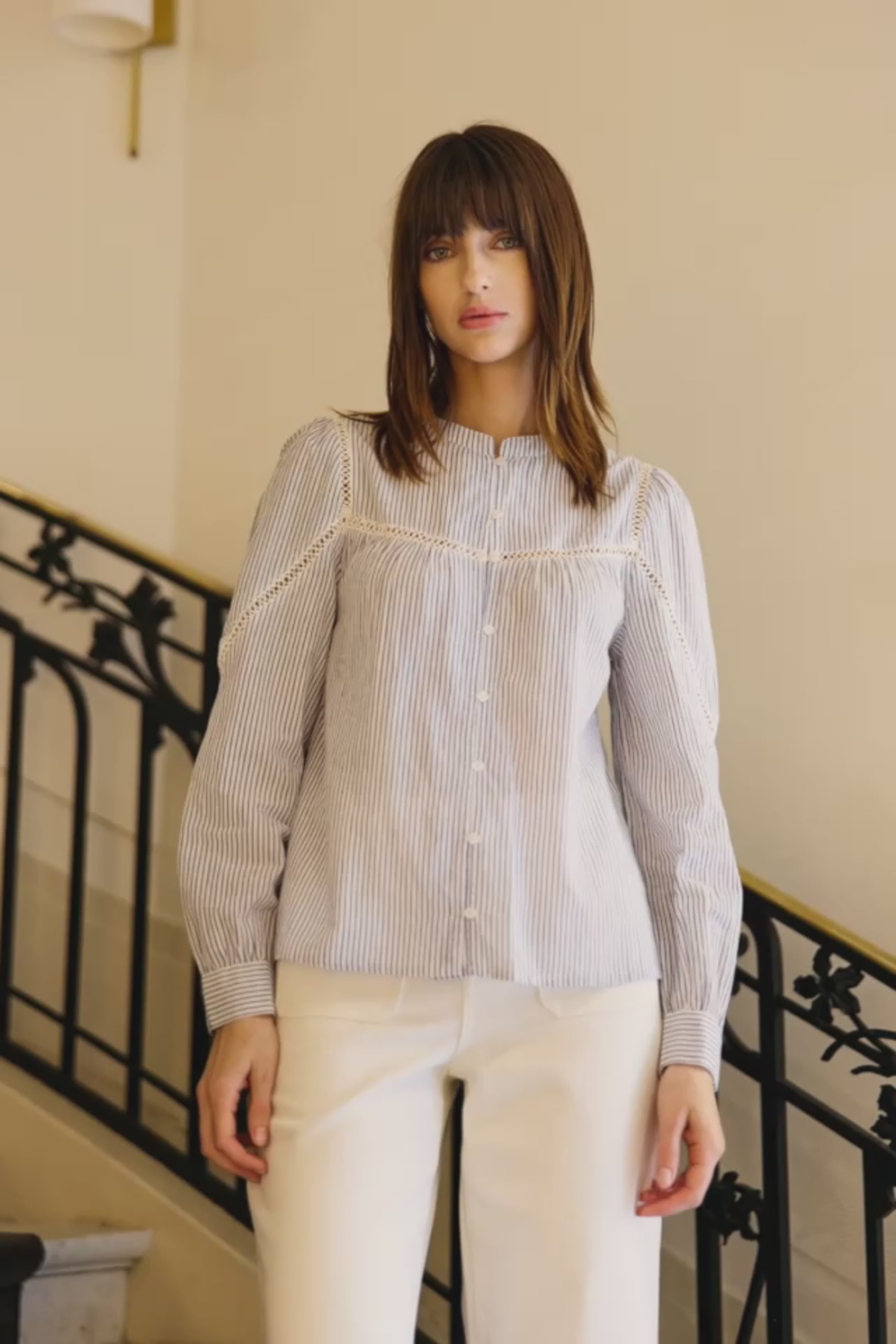 The Bayen blouse seduces with the elegance of its woven stripes and the delicacy of its ladder-work inlays. Its straight cut in 100% cotton ensures comfort and lightness, while the mandarin collar and full-length pearl buttoning add a touch of refinement. Openwork details subtly highlight the chest, back, sleeve, and armhole seams, creating a graphic and feminine play of transparency. Easy to combine, Bayen is a must-have piece for a chic and modern look.