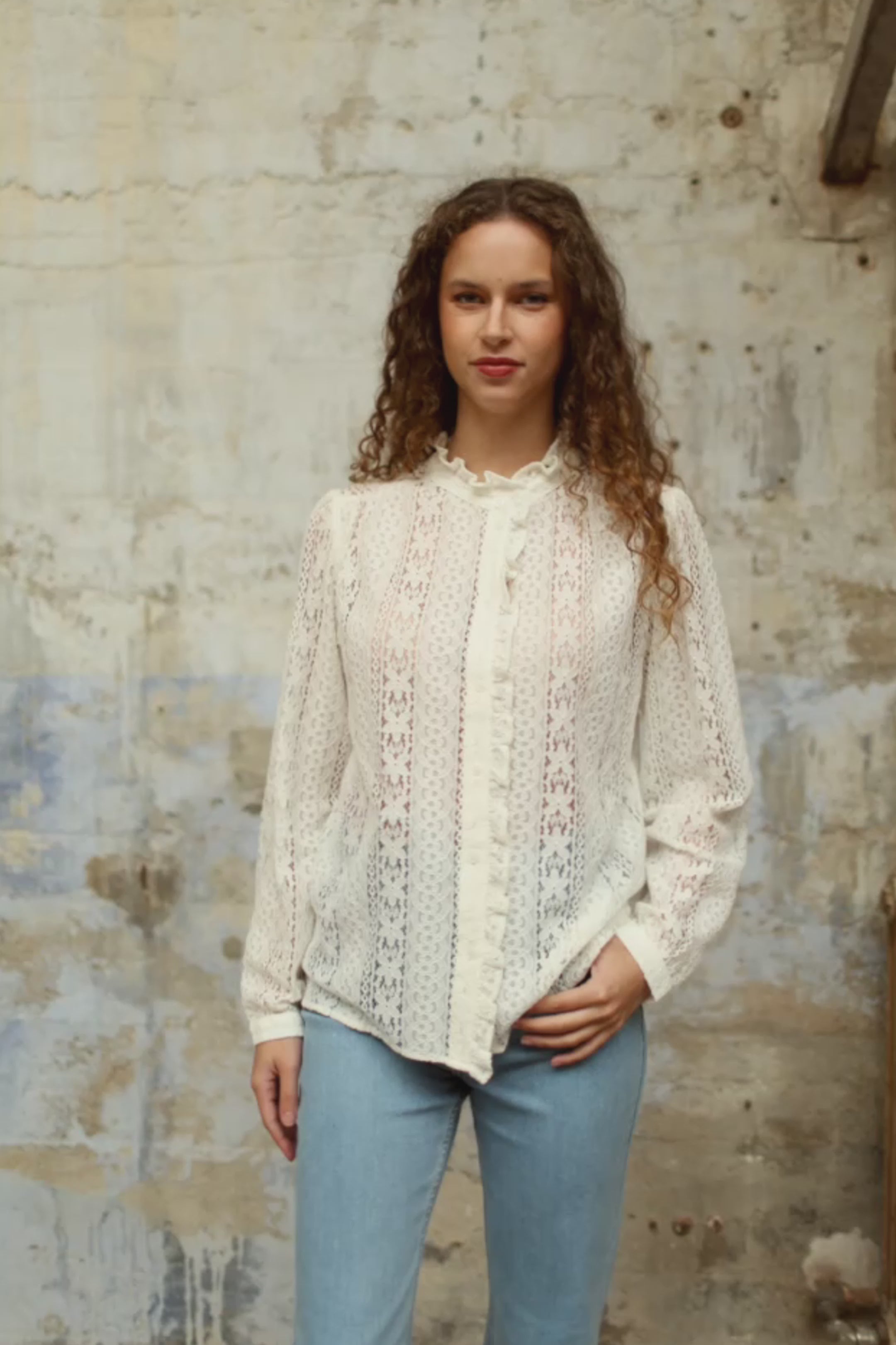 Besma, the ecru lace blouse with a straight cut, with a ruffled mandarin collar and buttoning at the front.