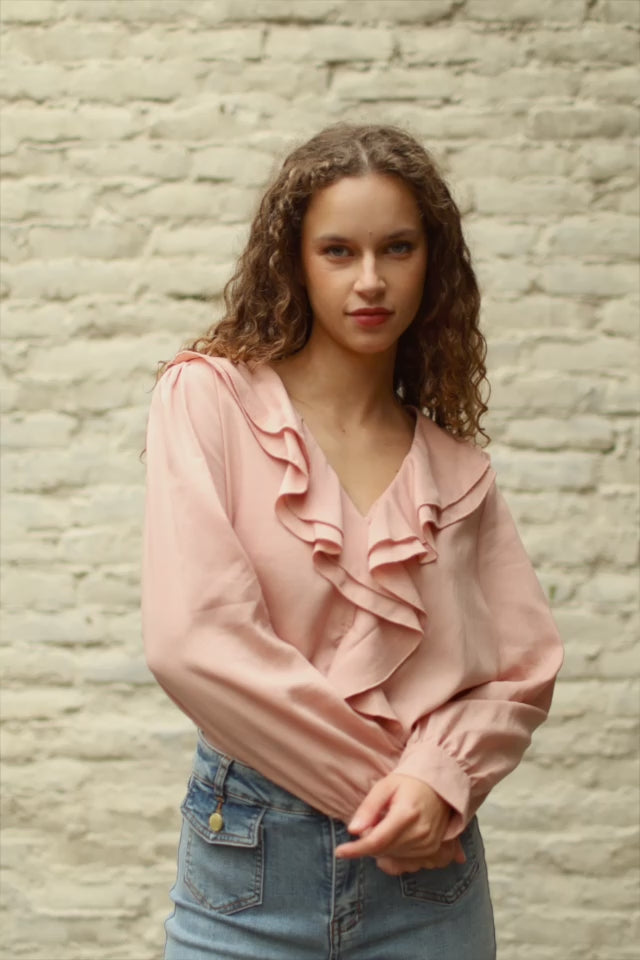 Boane, the loose-fitting powder-colored blouse, with a V-neck with a ruffled trim and long sleeves with slits at the wrists.