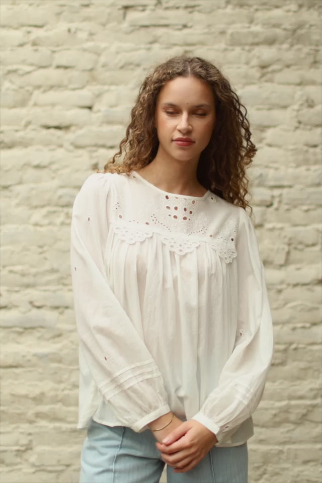 Brany, the ecru blouse with a loose fit, delicate embroidery, round neckline and long sleeves with buttoned slits.