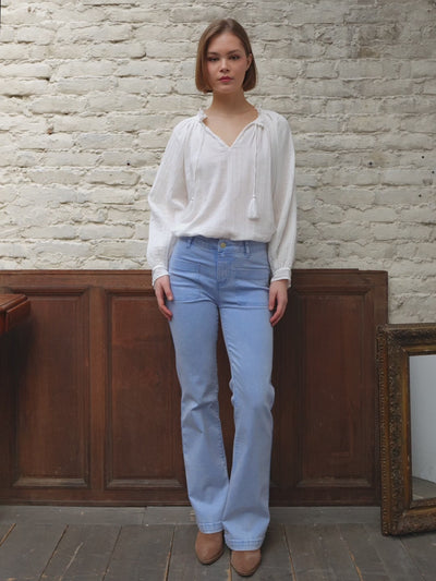 Sonny, the high-waisted flare jeans in sky-wash effect denim, with patch pockets at the front and faux pockets at the back.