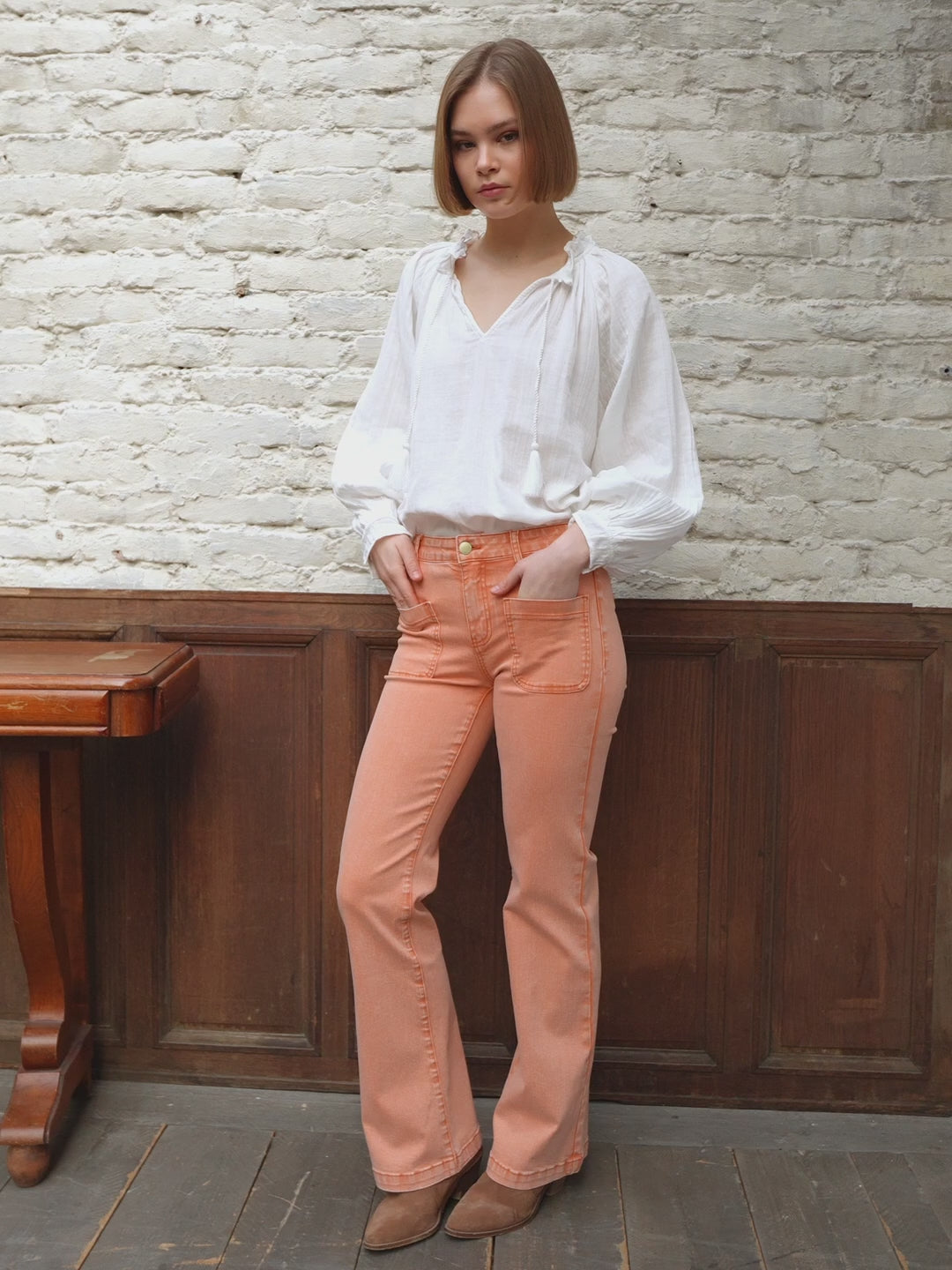 Sonny, the high-waisted flare jeans in orange faded denim, with patch pockets at the front and faux pockets at the back.