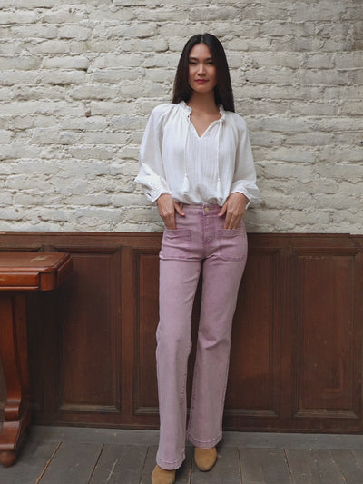 Sonny, the high-waisted flare jeans in pink washed-out denim, with patch pockets at the front and faux pockets at the back.