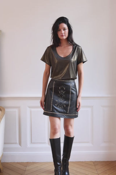 Fill, une jupe courte en cuir noir à coupe légèrement trapèze et taille haute, rehaussée de studs et d’une fermeture zippée sur le côté.