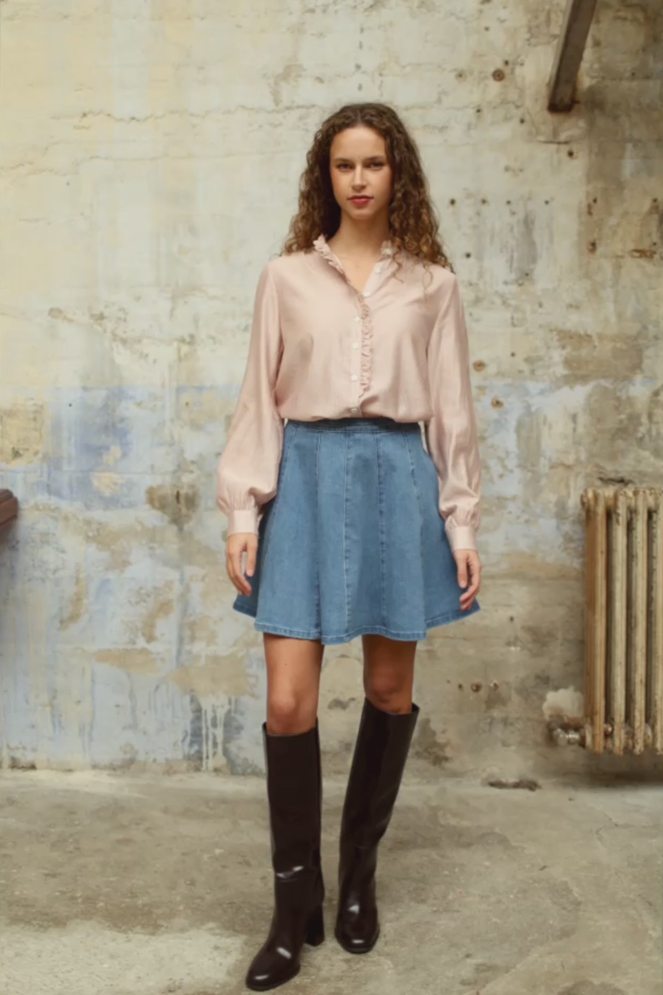 Joyan, the high-waisted, short-length, skater-style stone denim skirt with a zip fastening at the center back.