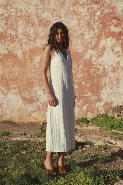 Rosanna est une robe midi naturelle qui dessine une silhouette longue et élégante. Sa ligne droite accompagne le corps avec simplicité tandis que l’encolure en V met délicatement le buste en valeur. Les fentes à l’avant et au dos apportent de la fluidité au mouvement et allègent la silhouette.