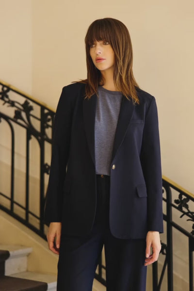 Vadal, la veste tailleur marine à coupe droite, avec col tailleur, boutonnage simple et poches à rabat.