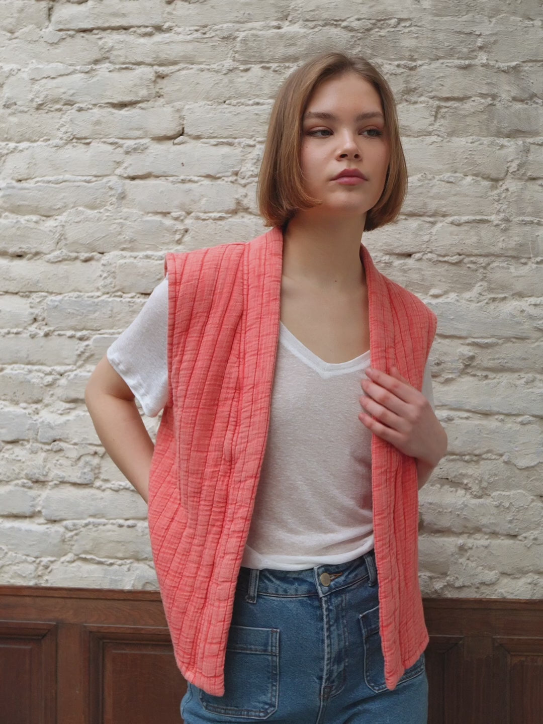 Vivie, the sleeveless vest in double quilted cotton gauze with a red washed effect, with V-shaped crossover and large armholes.