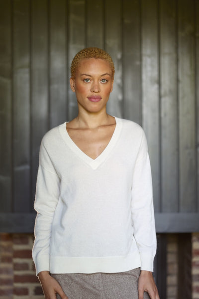 Melya, le pull en cachemire écru à col V et coupe ample, une pièce douce et moderne qui allie fluidité, confort et élégance casual en toute simplicité.