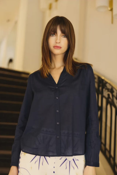 Belyne, la blouse droite en voile de coton marine, brodée de motifs constellation, avec encolure en V et boutonnage devant.