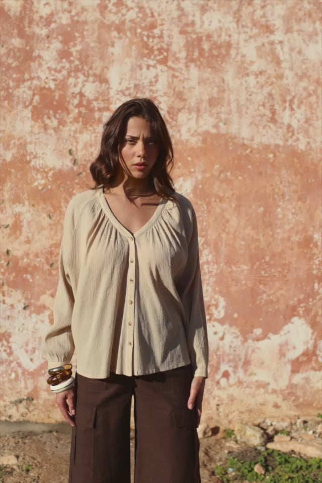 Bertina est une blouse ample beige qui dessine une silhouette fluide et décontractée. Son volume souple laisse le mouvement s’exprimer naturellement tandis que l’encolure en V élance le haut du corps et apporte une touche féminine discrète.