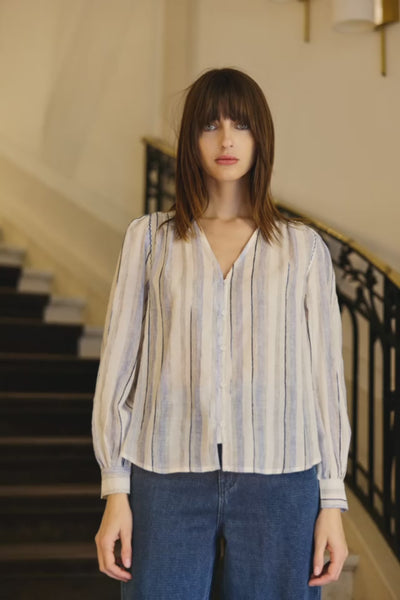 Blaike, la blouse ample en coton rayé bleu, avec encolure en V, manches amples et boutonnage devant.