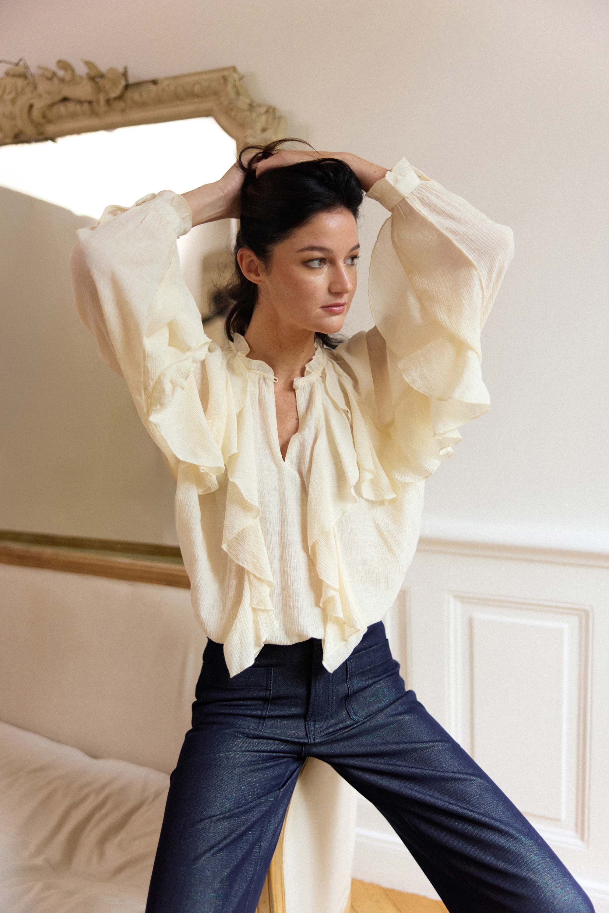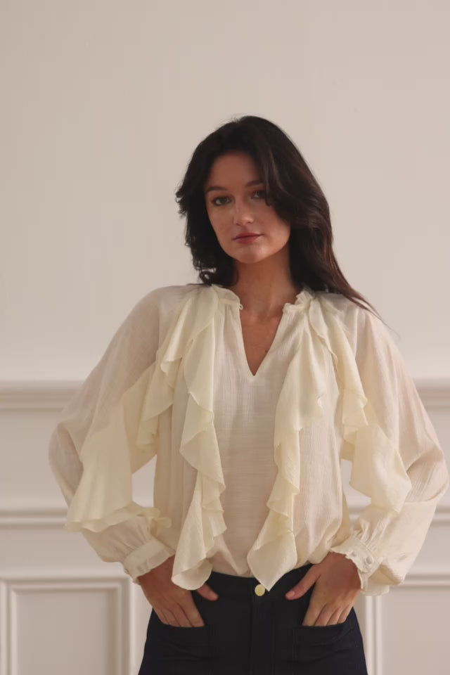 Bliss, une blouse évasée en tissu crêpé ornée de volants sur le devant et les manches, avec encolure ronde et boutonnage devant, pour une touche féminine et légère.