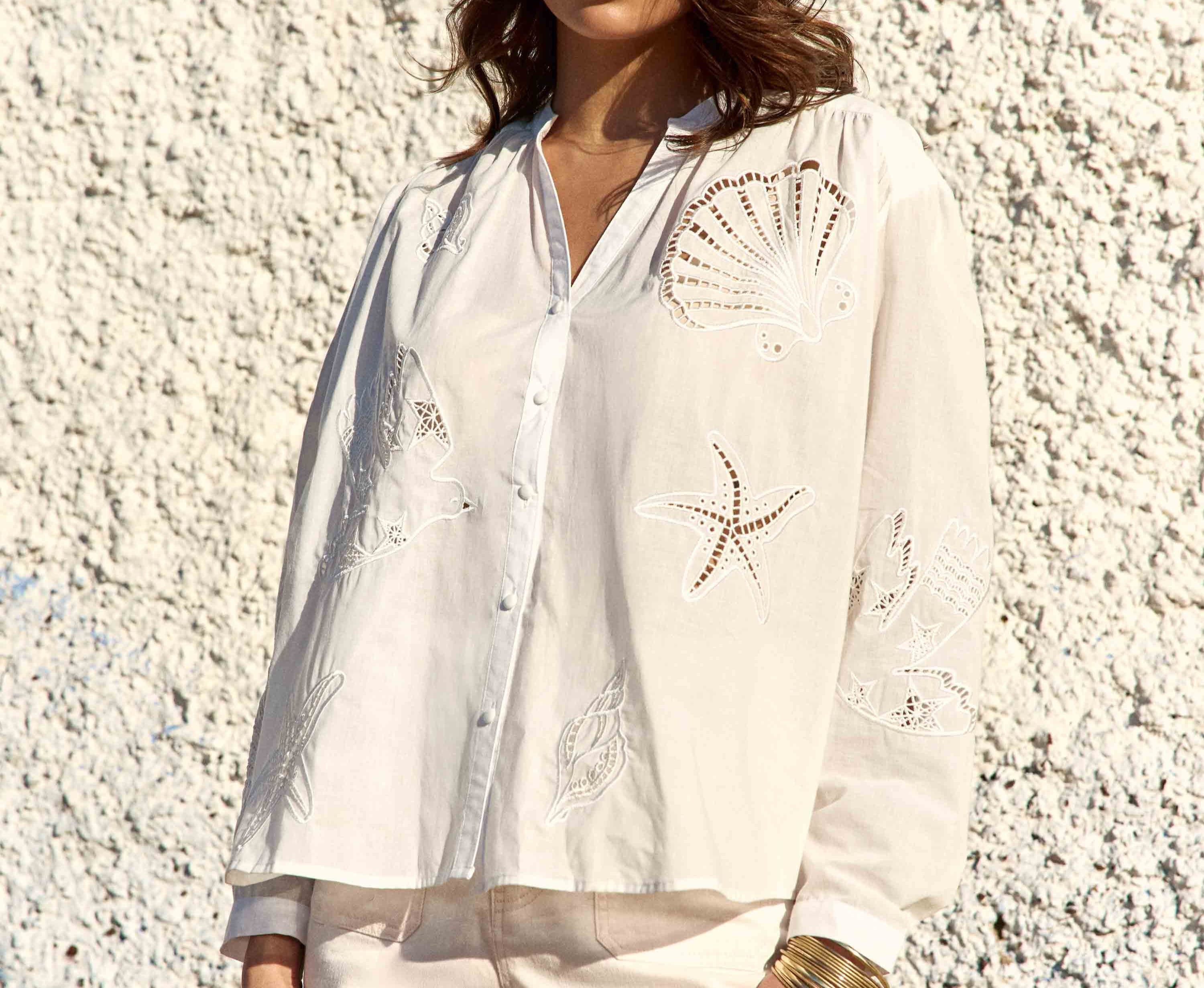 Boliane est une blouse blanche à la coupe ample qui enveloppe la silhouette d’une légèreté délicate et lumineuse. Son encolure en V ouvre le buste avec grâce, tandis que ses broderies anglaises ajourées aux motifs marins laissent transparaître la peau et donnent à la pièce un effet aérien.