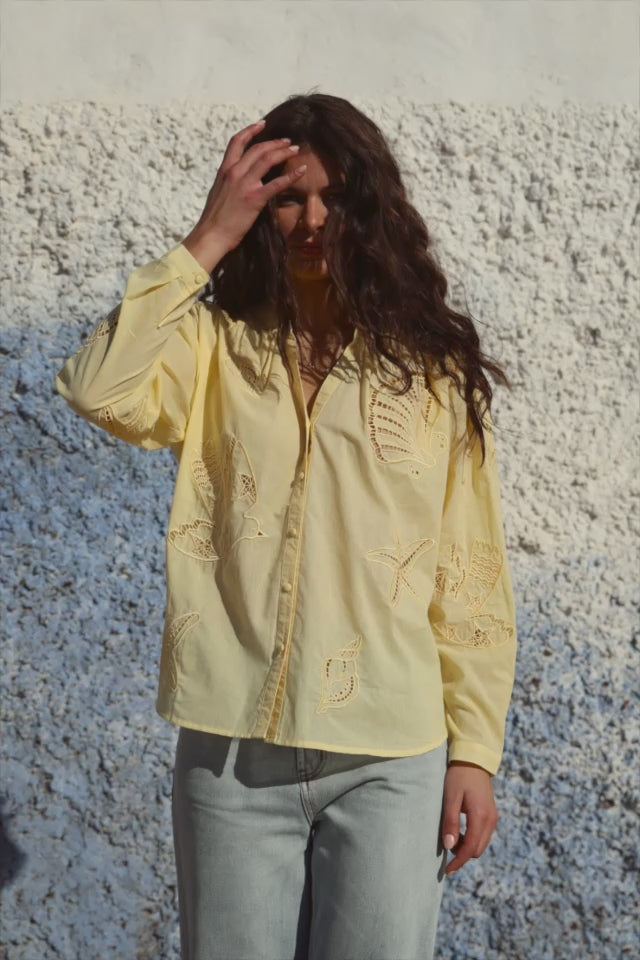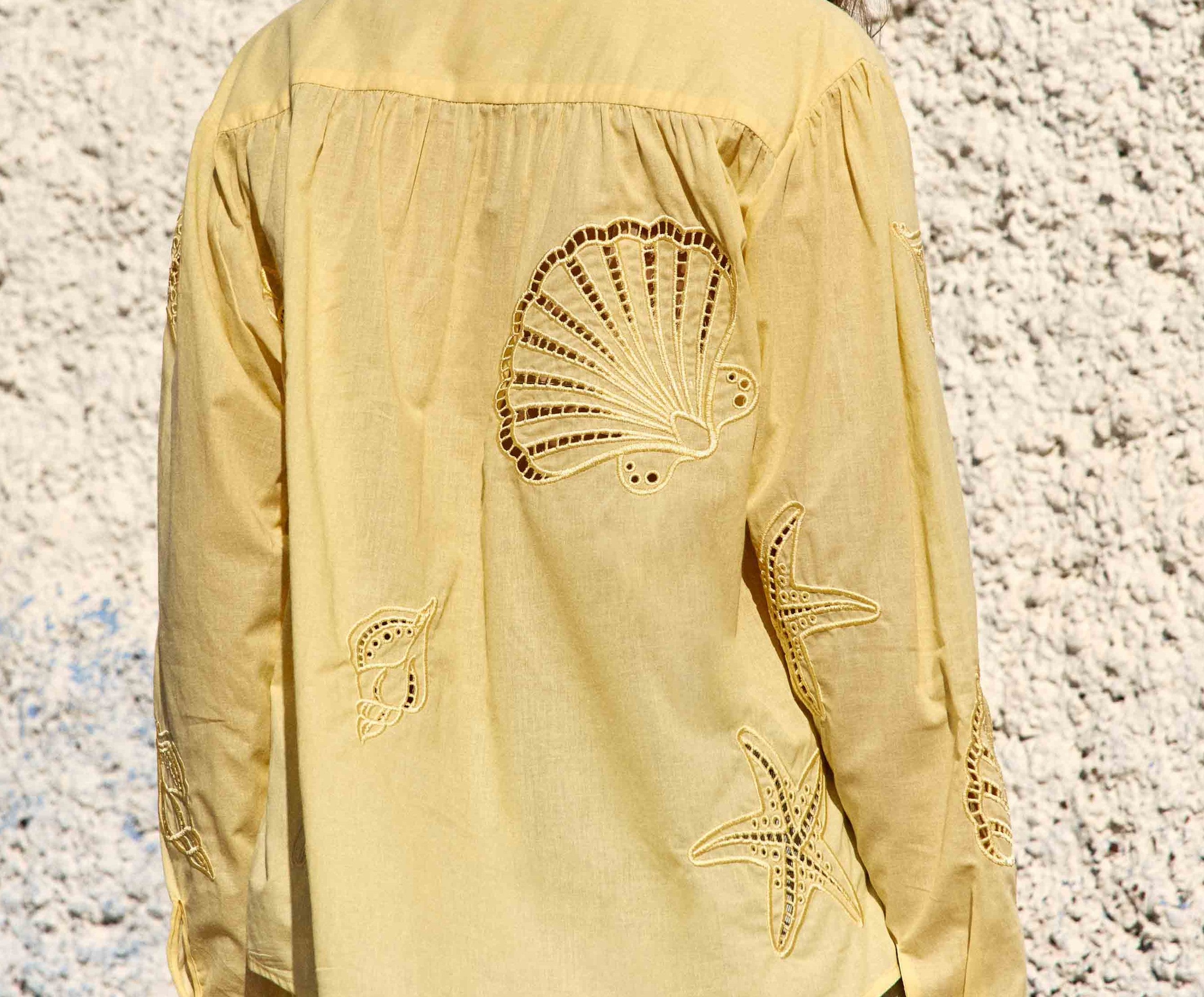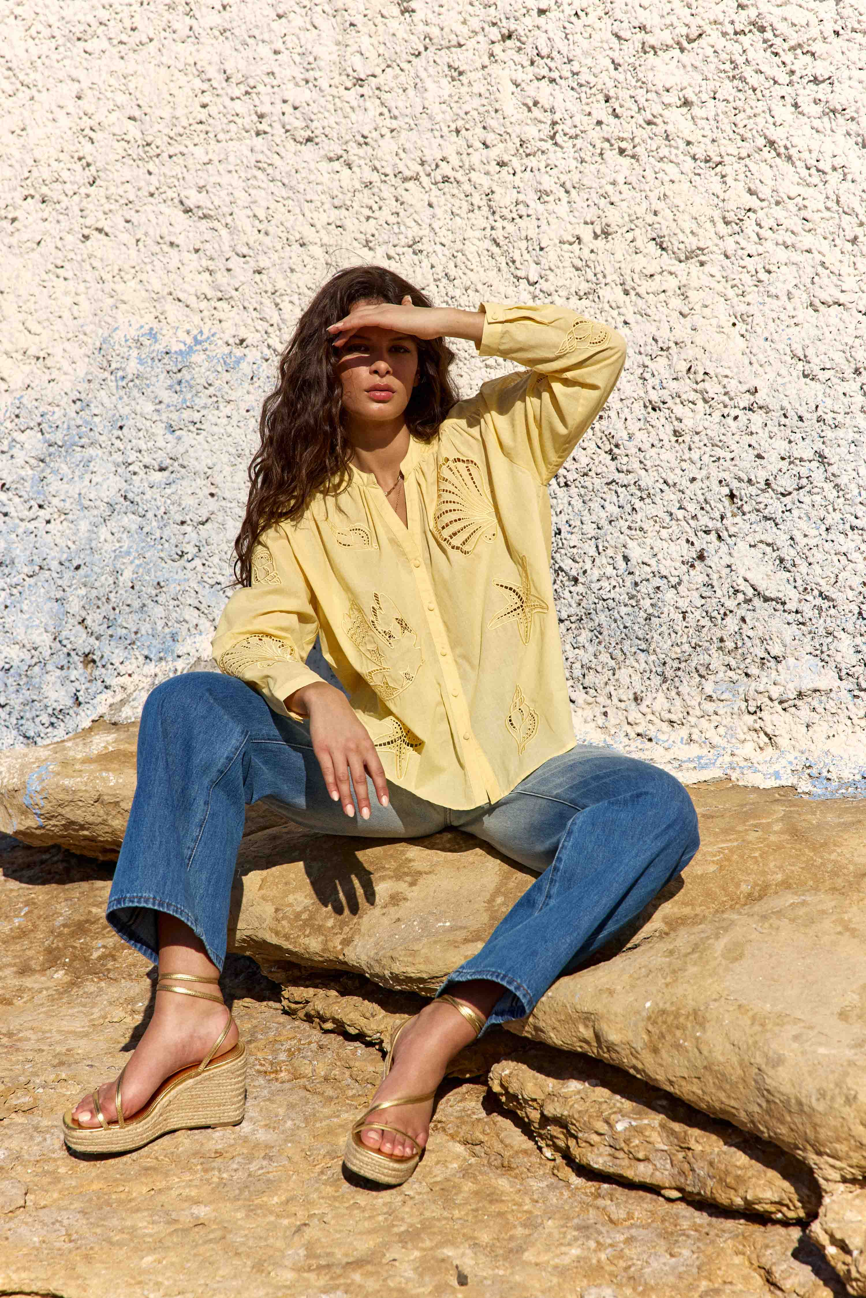 Boliane est une blouse jaune à la coupe ample qui illumine la silhouette avec douceur et élégance. Son encolure en V met le buste en valeur et apporte une touche féminine, tandis que ses broderies anglaises ajourées aux motifs marins habillent le tissu avec raffinement et laissent passer la lumière pour un rendu aérien.