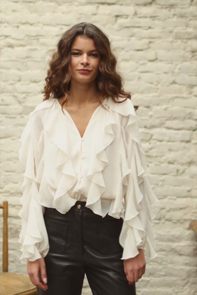 Bolta, la blouse écrue à coupe ample, en tissu texturé effet gaufré, avec encolure en V et volants en cascade sur le buste et les manches.