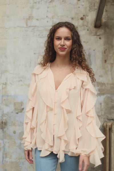 Bolta, la blouse poudre à coupe ample, en tissu texturé effet gaufré, avec encolure en V et volants en cascade sur le buste et les manches.