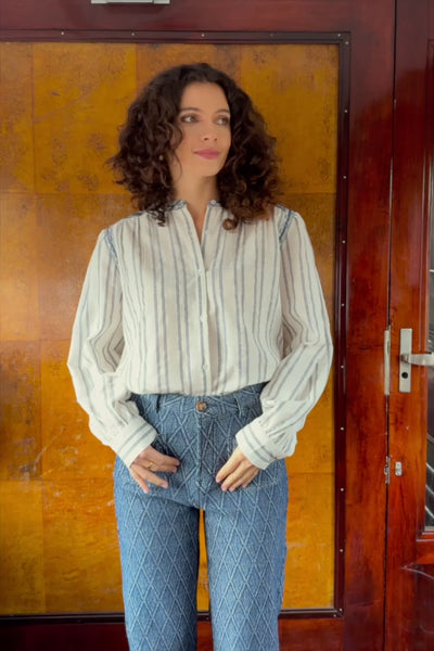 Brielly, une blouse fluide et droite avec tissage à rayures et broderies délicates, col officier et manches longues avec fentes boutonnées, pour un style élégant et moderne.