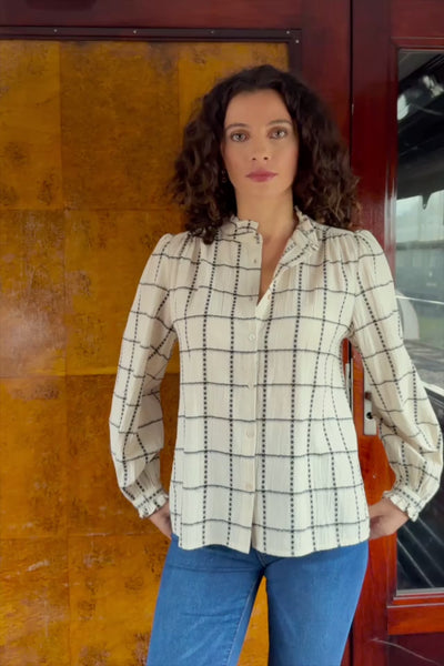 Byron, une blouse droite et élégante en jacquard à carreaux, avec col officier à volants et manches longues volantées avec fentes boutonnées, pour un style raffiné et féminin.