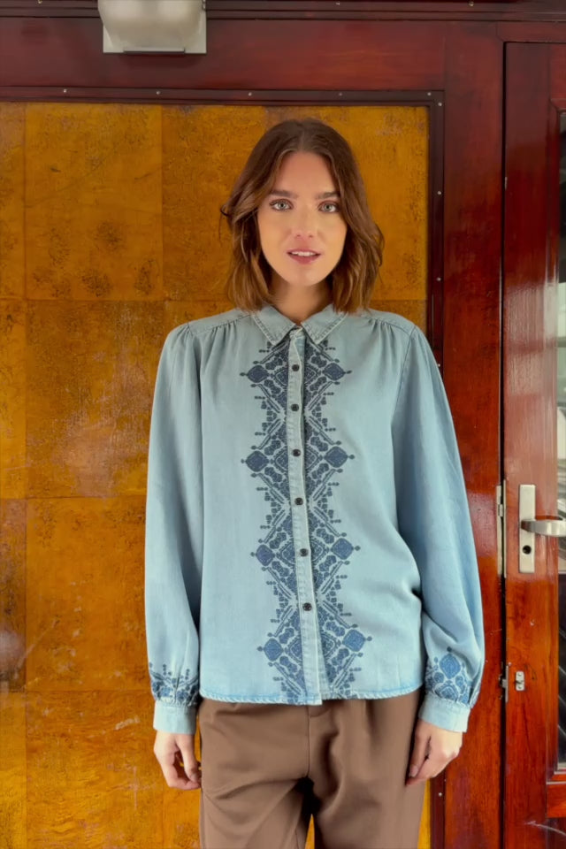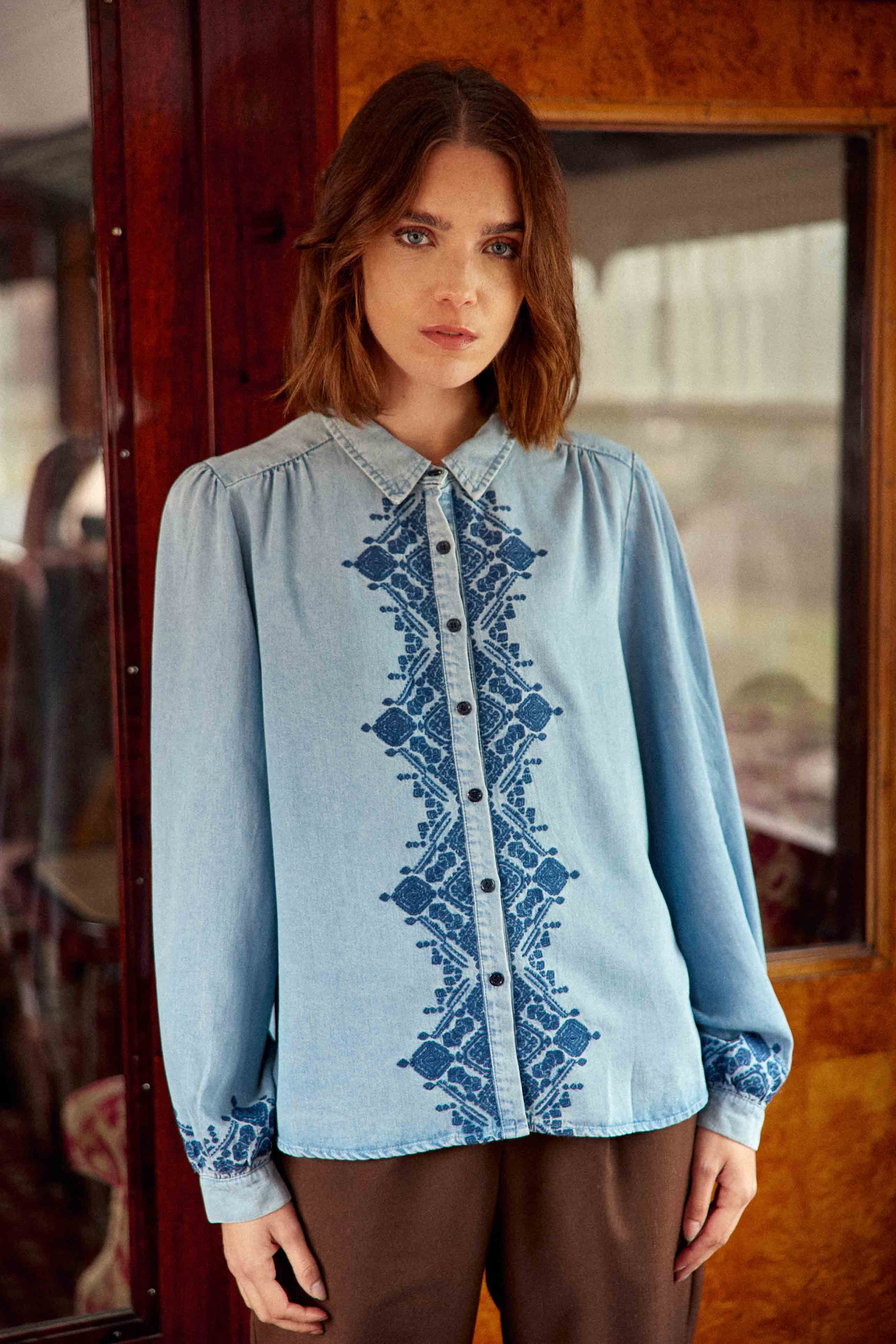 Cyna, une chemise ample et élégante en lyocell, brodée avec soin, col chemise et manches longues avec fentes boutonnées, pour un style moderne et raffiné.