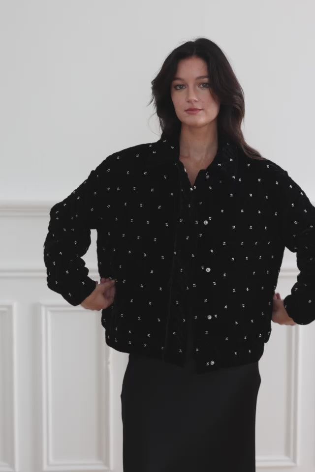 Vany, un blouson teddy en velours matelassé orné de perles, avec patte de boutonnage à pressions, finitions élastiquées et poches raglan, pour un look moderne et élégant.