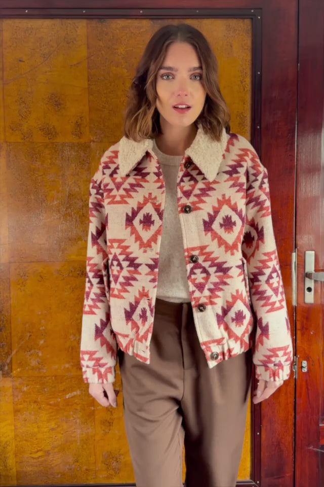 Velky, un blouson droit au tissage inspiré des motifs amérindiens, avec col revers en tissu moutonné, manches longues et finitions élastiquées, pour un style confortable et moderne.