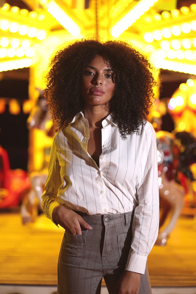 Carli, un chemisier droit en coton à rayures strass, avec col classique et boutons nacrés, pour un style chic et raffiné au quotidien.