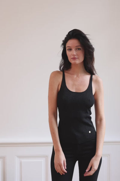 Juana, un débardeur en maille fine noire légèrement brillante, à décolleté arrondi et finition bas arrondi, parfait à porter seul ou sous une veste.