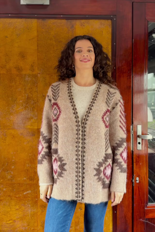 Mayra, un gilet long et ample aux motifs inspirés des cultures amérindiennes, avec finitions bord-côtes, pour un look chaleureux et graphique.