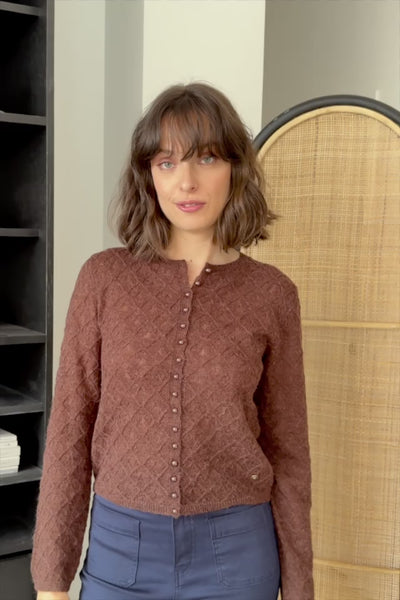 Gilet Meg en maille point fantaisie, encolure ronde, manches longues et boutonnage devant.