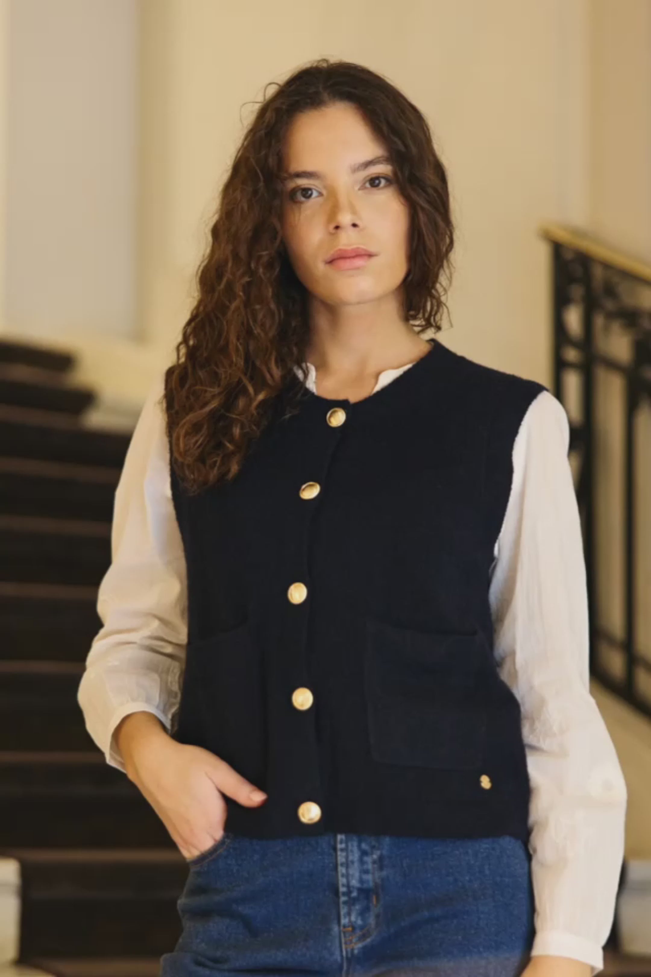 Mori, le gilet sans manches en maille chinée marine, avec encolure ronde, poches plaquées et boutonnage devant
