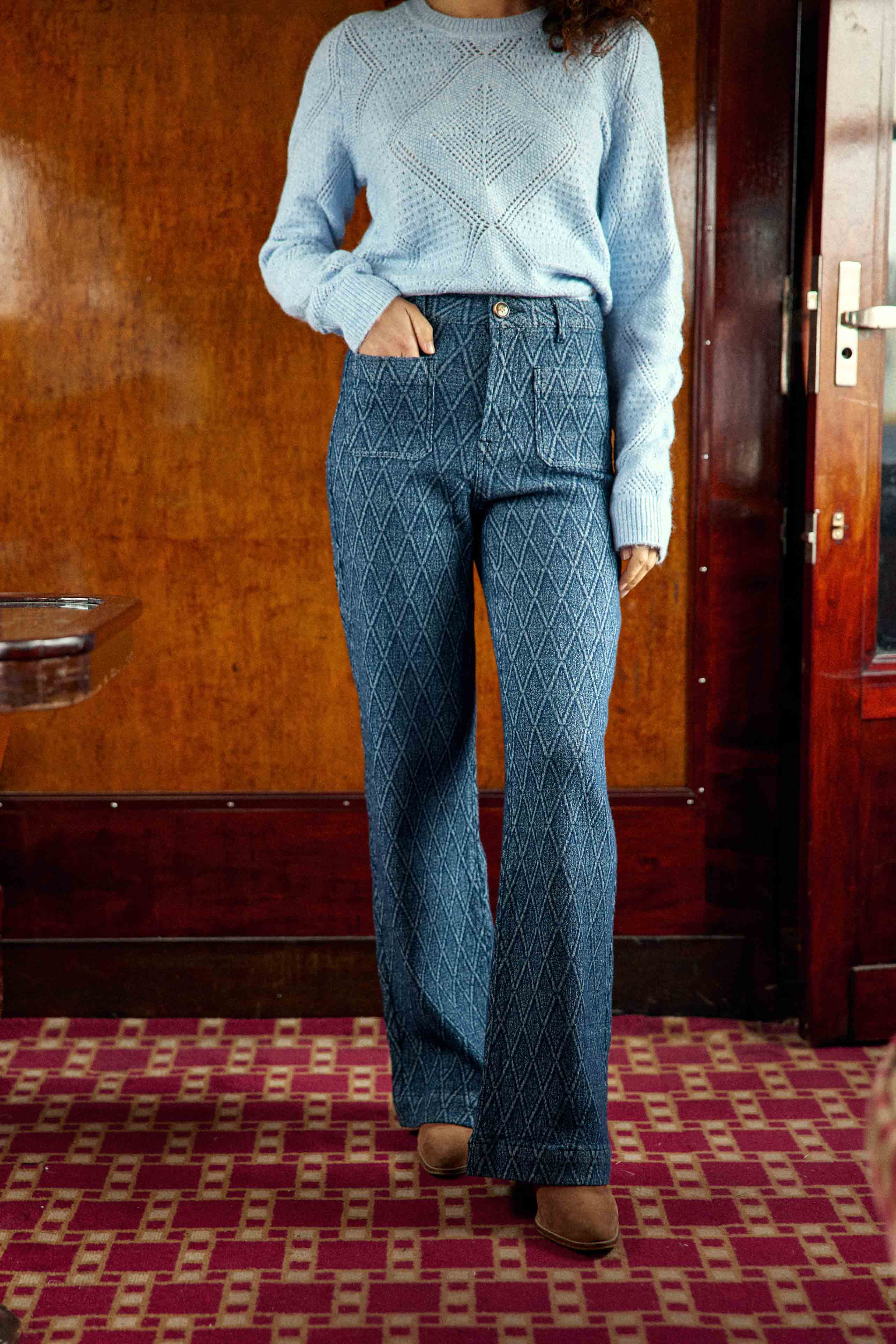 Atlanty, un jean taille haute à coupe large avec tissage jacquard denim, poches plaquées et fermeture zippée, pour un style structuré et moderne.