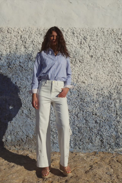 Atlantys est un jean écru à la coupe droite et à la jambe large qui allonge la silhouette et apporte une allure lumineuse et féminine. Sa taille haute met la taille en valeur avec naturel, tandis que ses broderies anglaises aux motifs marins apportent du relief et attirent le regard tout au long de la jambe pour un rendu soigné et estival.