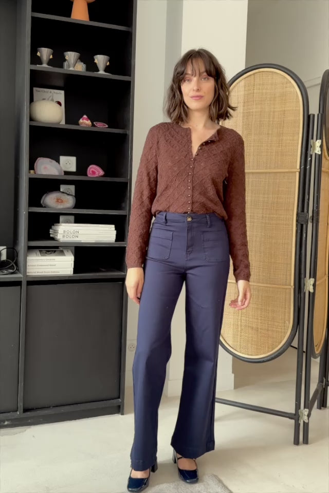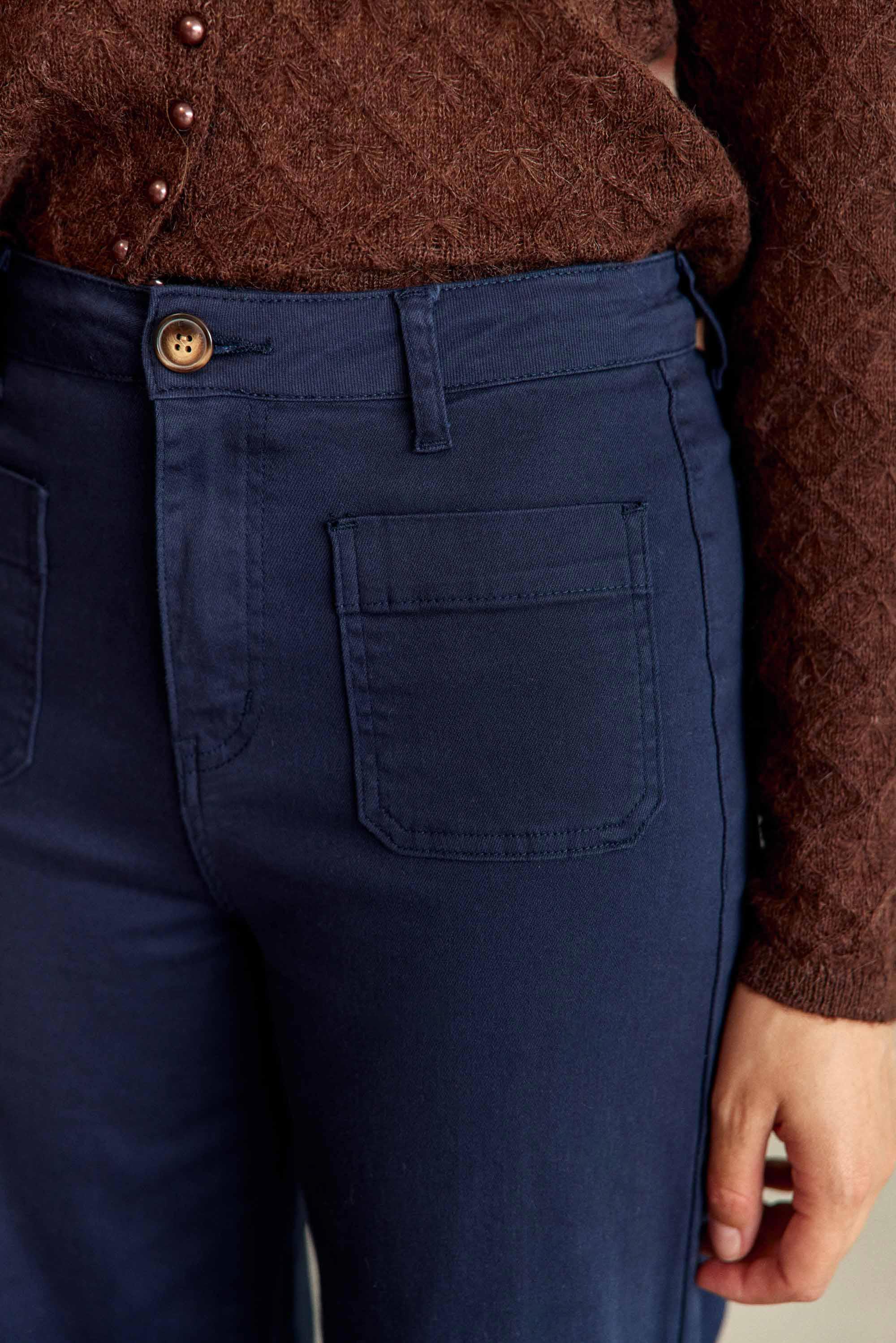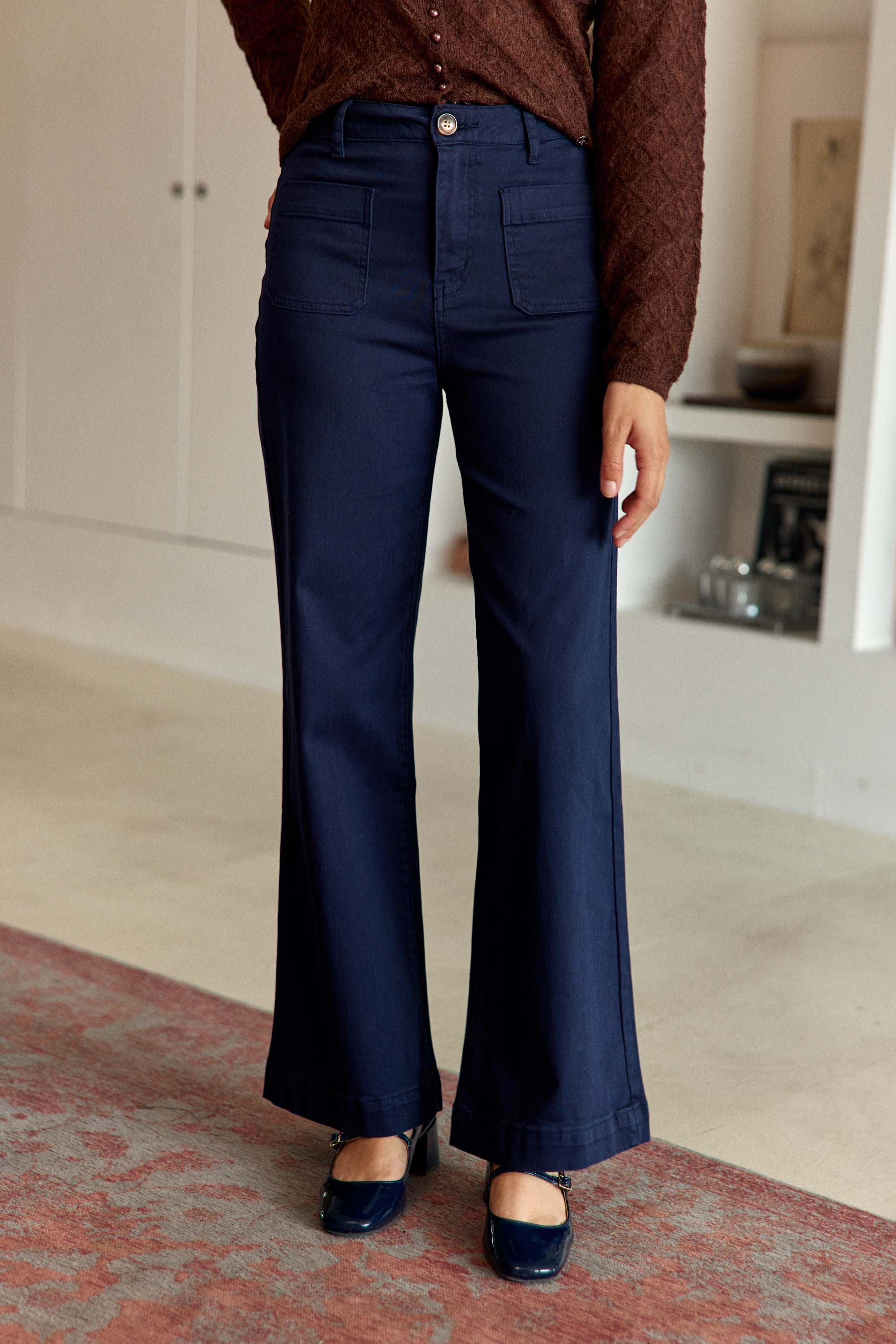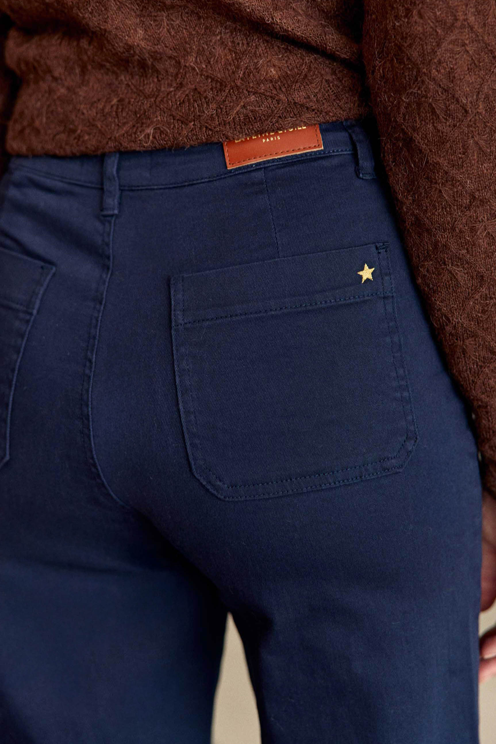 Atlantyt, le jean marine à coupe évasée, un essentiel moderne qui allie confort, style et allure féminine intemporelle.