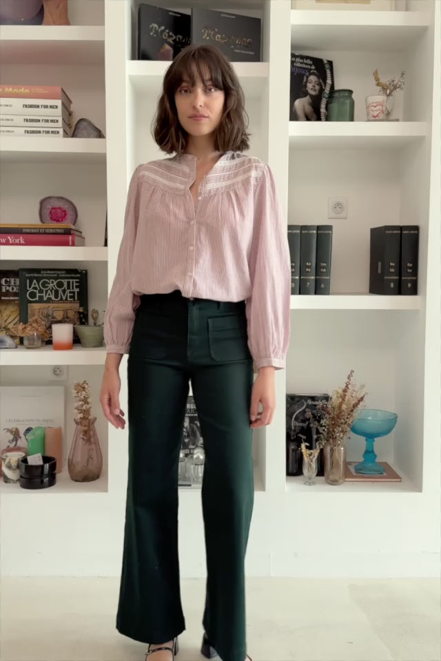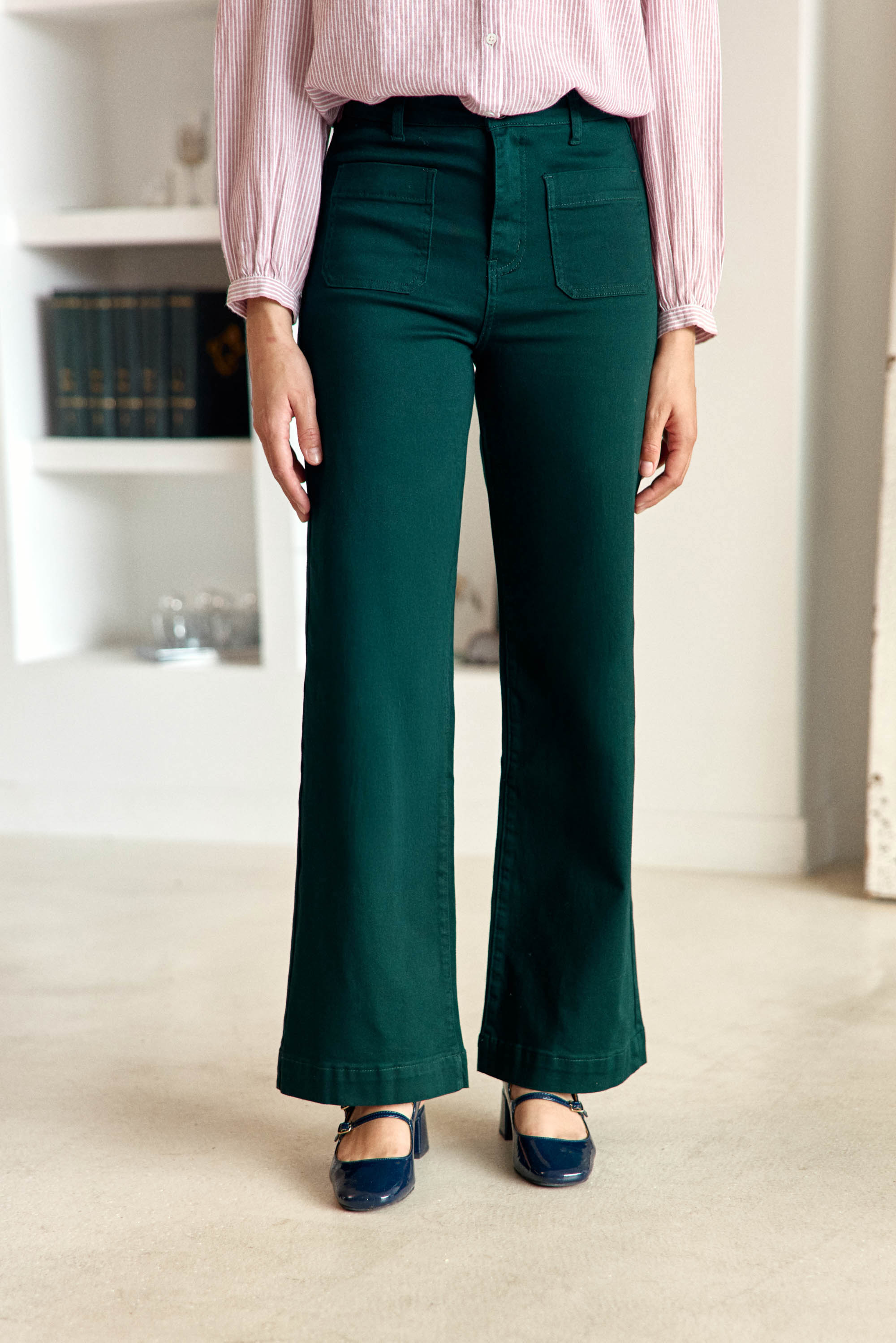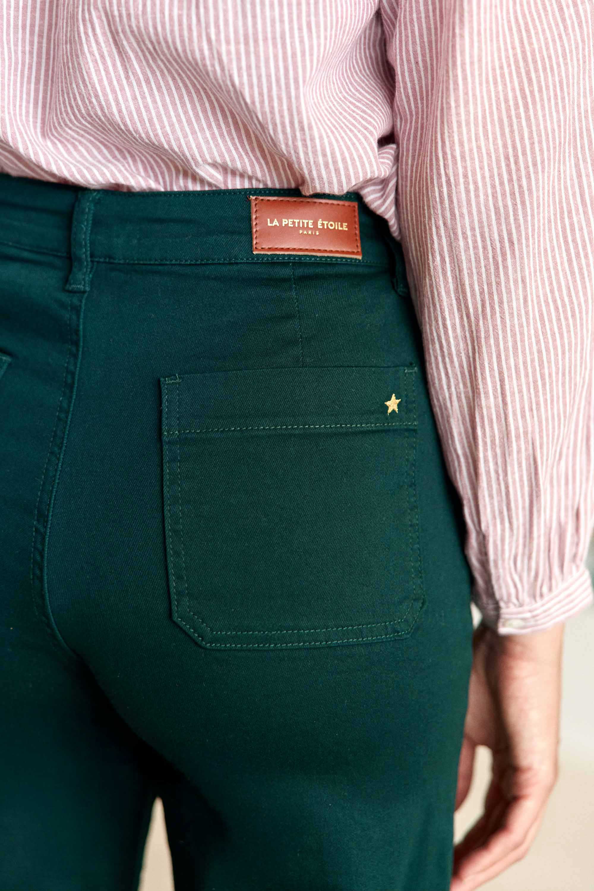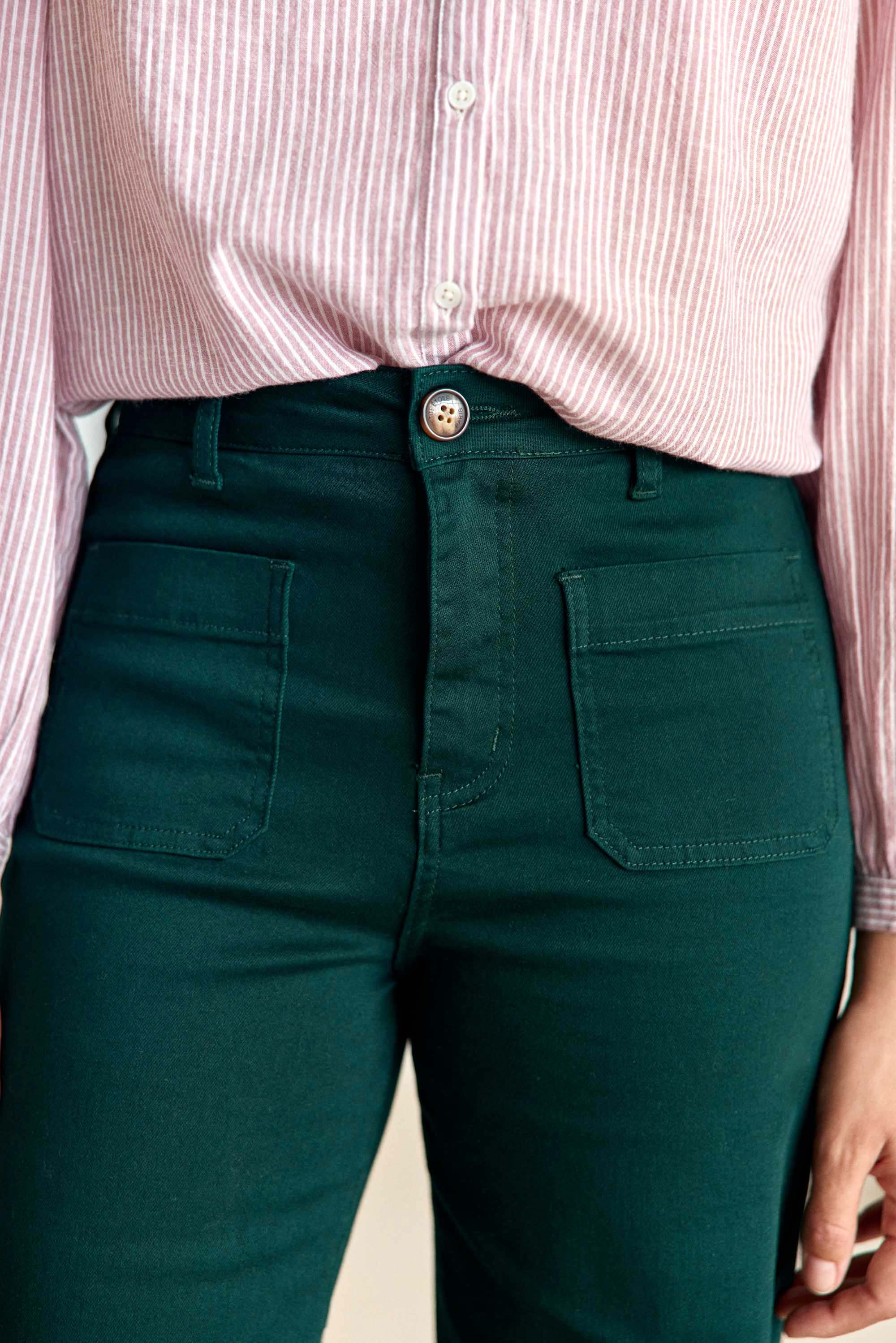 Atlantyt, le jean vert anglais à coupe évasée, un essentiel moderne qui allie confort, style et allure féminine intemporelle.