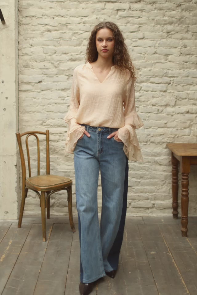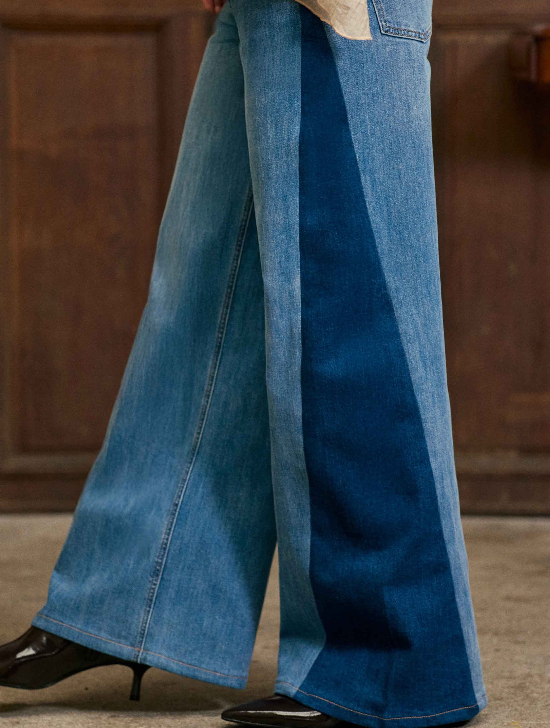 Paiva, le jean flare bi-color stone à taille haute, ajusté aux hanches et évasé sur les jambes, avec patch denim contrasté sur les côtés.