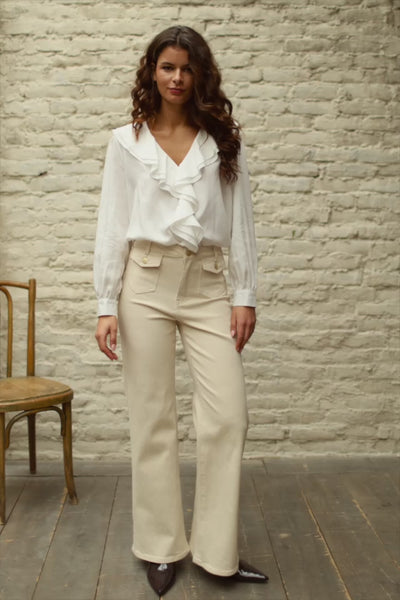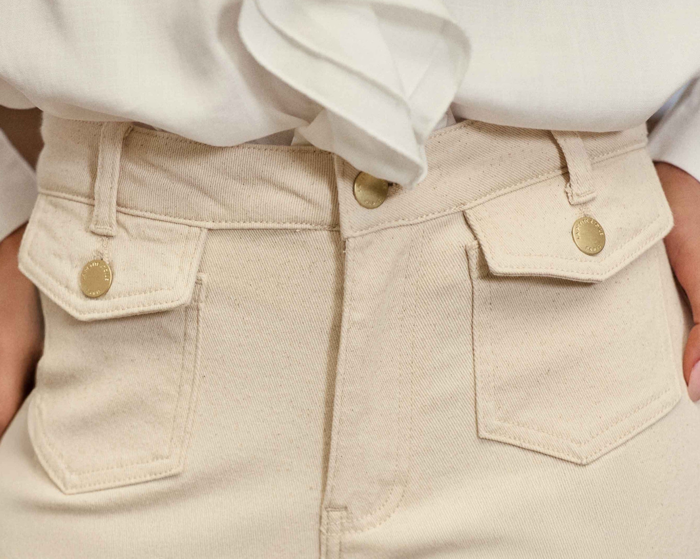 Peyton, le jean beige à coupe flare large et taille haute, ajusté aux hanches et évasé sur les jambes, avec poches à rabat devant.