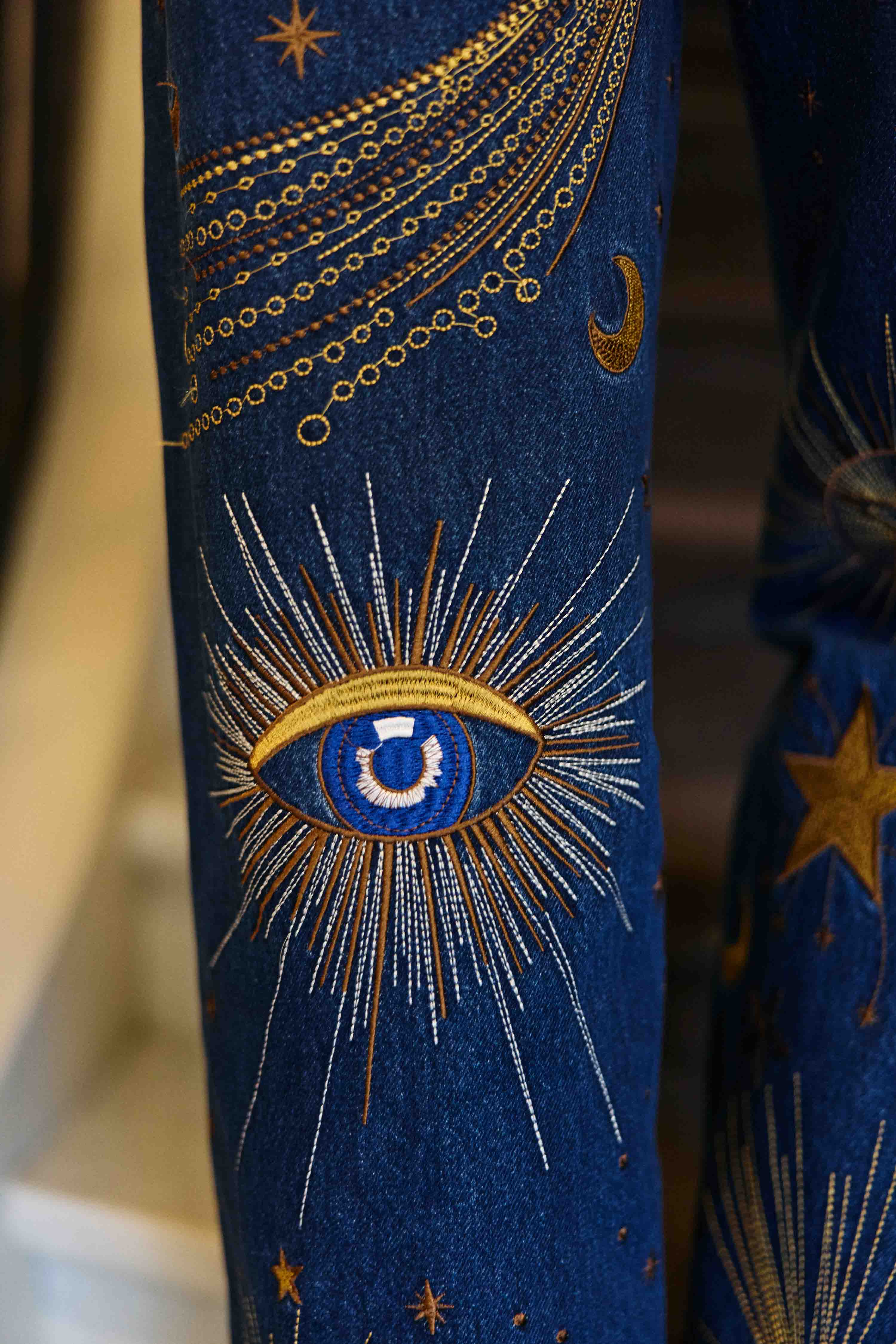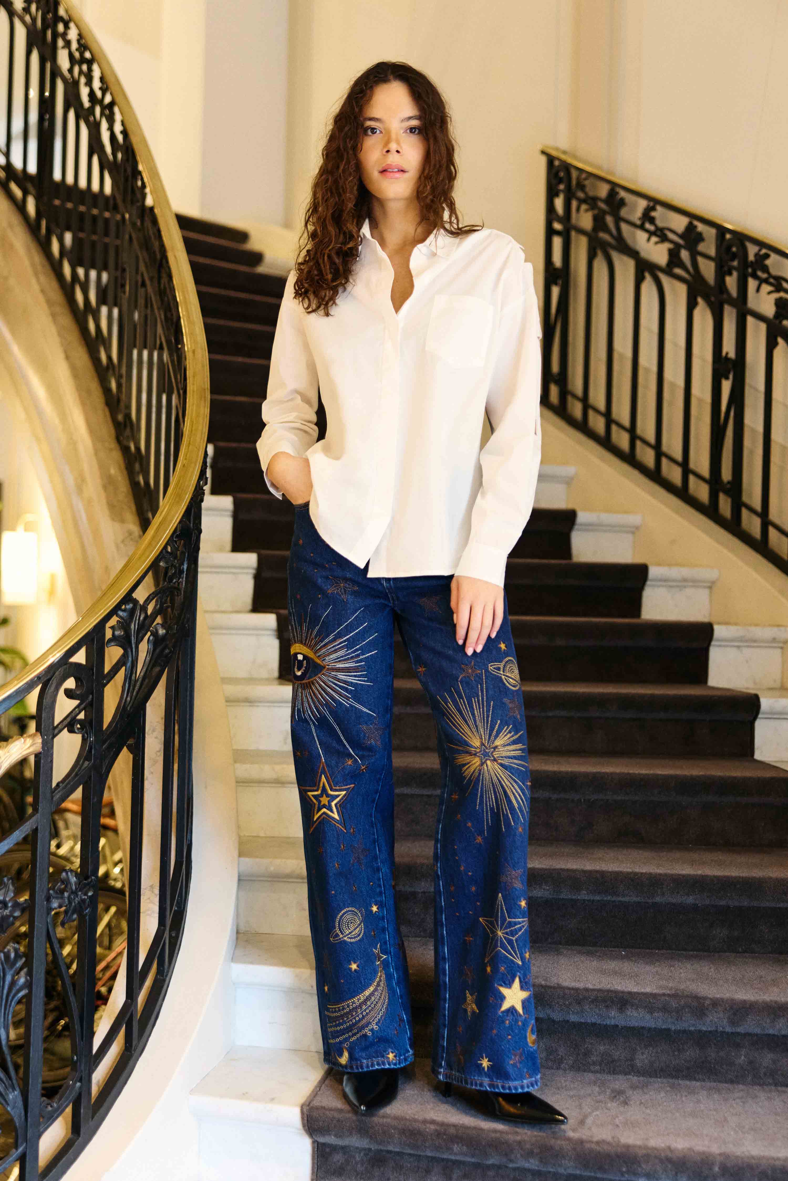 Zephyra, le jean droit en denim wash brodé de motifs constellation, taille haute et doté de cinq poches.