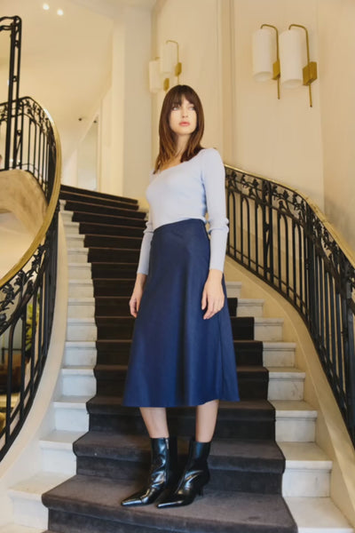 Jilla, la jupe midi évasée brut, à taille haute, avec fermeture zippée invisible sur le côté.