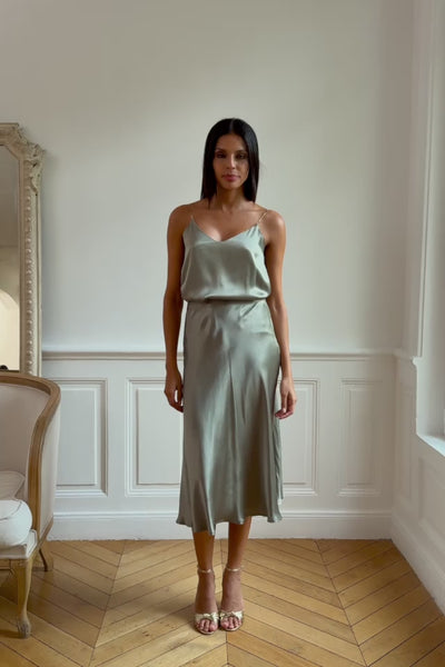 Jilly, une jupe midi en satin vert amande avec fermeture zippée sur le côté, pour un look féminin et délicat.