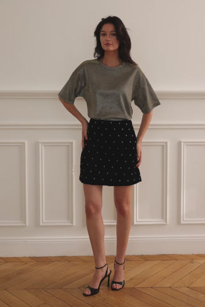 Joan, une jupe courte droite en velours matelassé orné de perles, taille haute et fermeture zippée sur le côté, une pièce élégante et moderne.