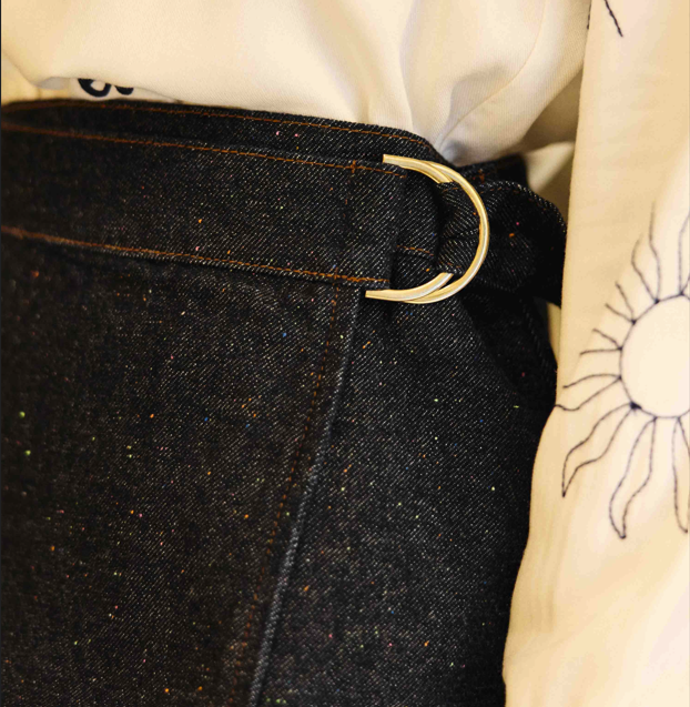 Joss, la jupe courte portefeuille en denim brut, à taille haute, avec un tombé structuré.